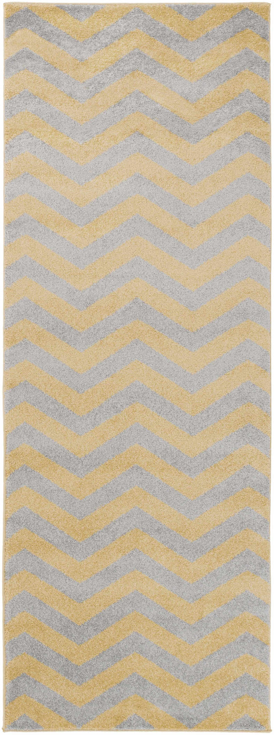 A rectangular area rug featuring a bold, repeating chevron (zigzag) pattern running horizontally across the entire surface. The pattern alternates between wide bands of warm golden yellow and soft silver-gray, with each band having a slightly textured, slightly tonal quality from the machine-woven polypropylene pile. The chevron points are sharp and well-defined, creating a clean, graphic look. The pile is medium height with a smooth, uniform surface texture — no fringe, no tassels, bound edges on all sides. The overall impression is bright, modern, and energetic — a two-color rug that commands attention without being busy.