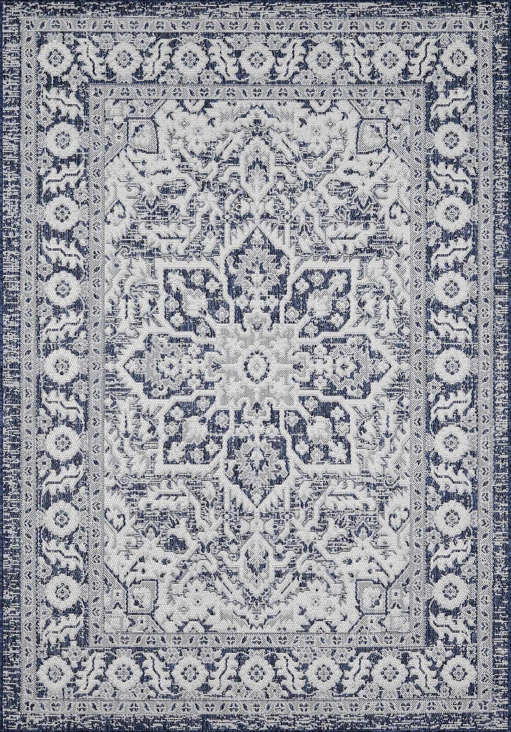 Bring a touch of traditional style to your outdoor living space with the Etoile Navy Blue Performance Area Rug. Crafted from polypropylene, this no-pile rug is designed to withstand high traffic and outdoor use, making it ideal for your patio or deck. This machine-woven construction is made in Turkey, and its durable nature makes it perfect for any environment. For best results, pair with a rug pad for extra stability and comfort. Cleaning is easy - just hose off with water and hang to dry!