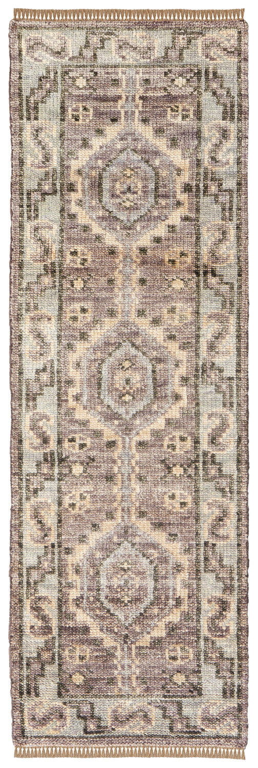 • Detailed Bugasan Area Rug close-up. Hand-knotted wool rug in gray, teal, brown, and plum with an oriental pattern. Design-Rectangle-810 Detailed view of the hand-knotted Bugasan Area Rug. Gray, teal, plum, and brown tones. Bohemian style. Front