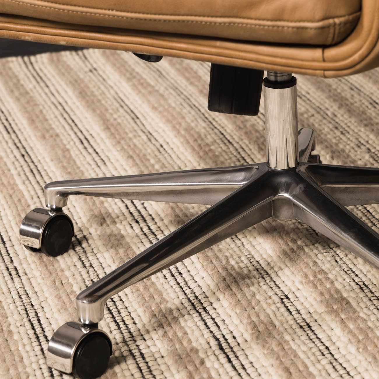• Close-up of the Parkerfield Area Rug. Beige, black, and gray tones with a vintage-inspired geometric pattern. Design-Rectangle-5373 Living room scene featuring a neutral sofa and the beige Parkerfield Area Rug with a vintage, traditional pattern. Roomscene-Rectangle