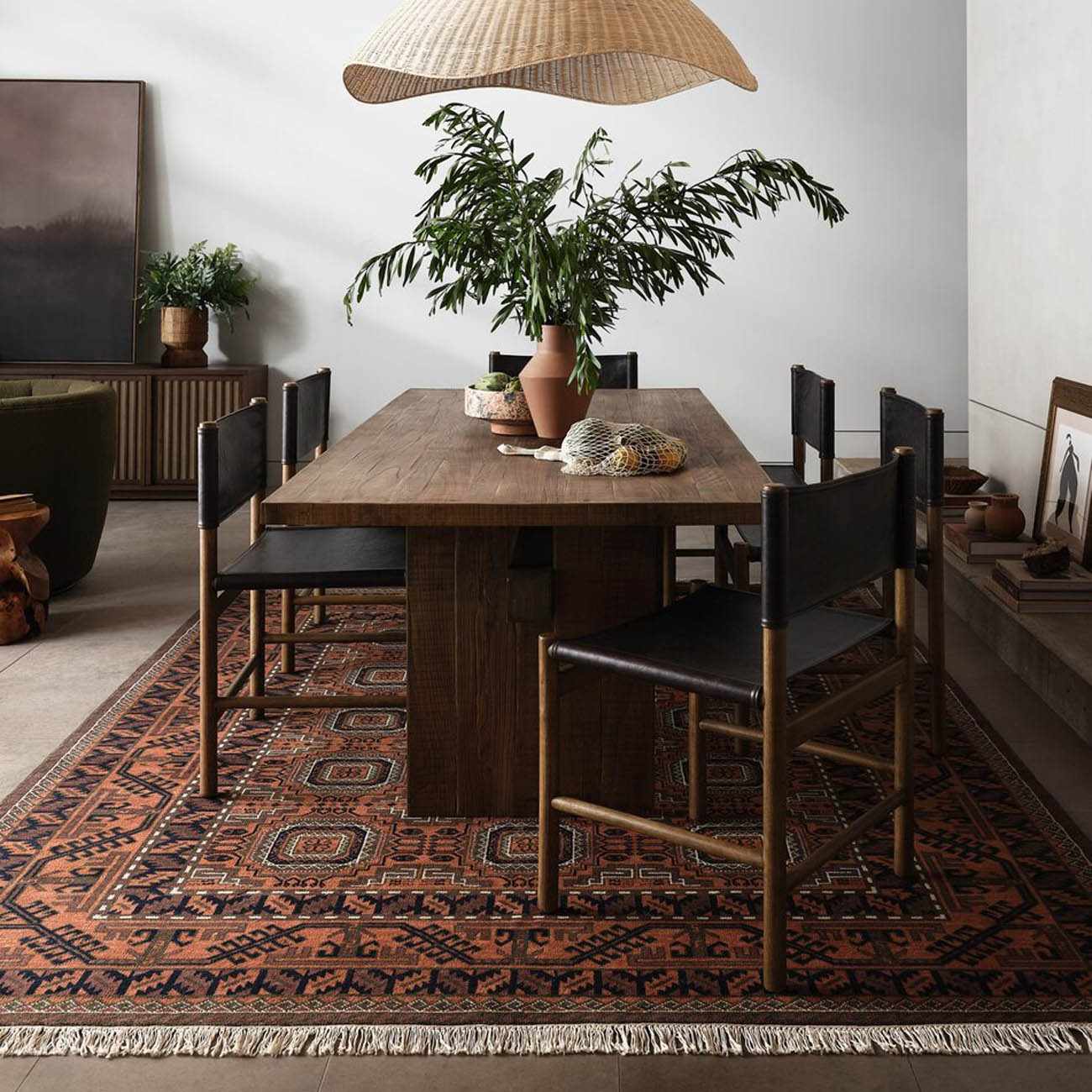 When selecting a dining room rug, choose one large enough to fit under the table and chairs, ensuring that when the chairs are pulled out, they remain on the rug for a balanced look.