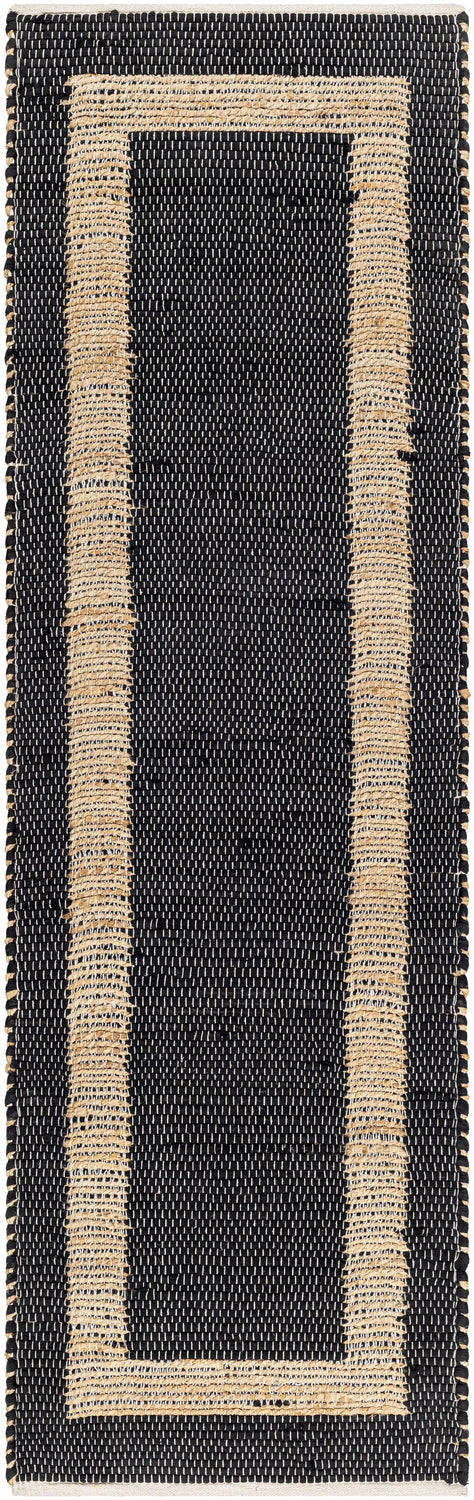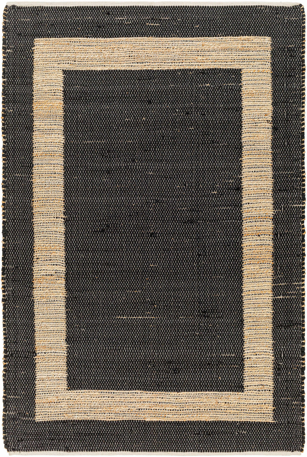 A deep, near-charcoal black dominates the center field, while a warm natural tan jute border frames the entire rug — the contrast is graphic and clean, with the earthy jute tones softening what could otherwise feel stark.