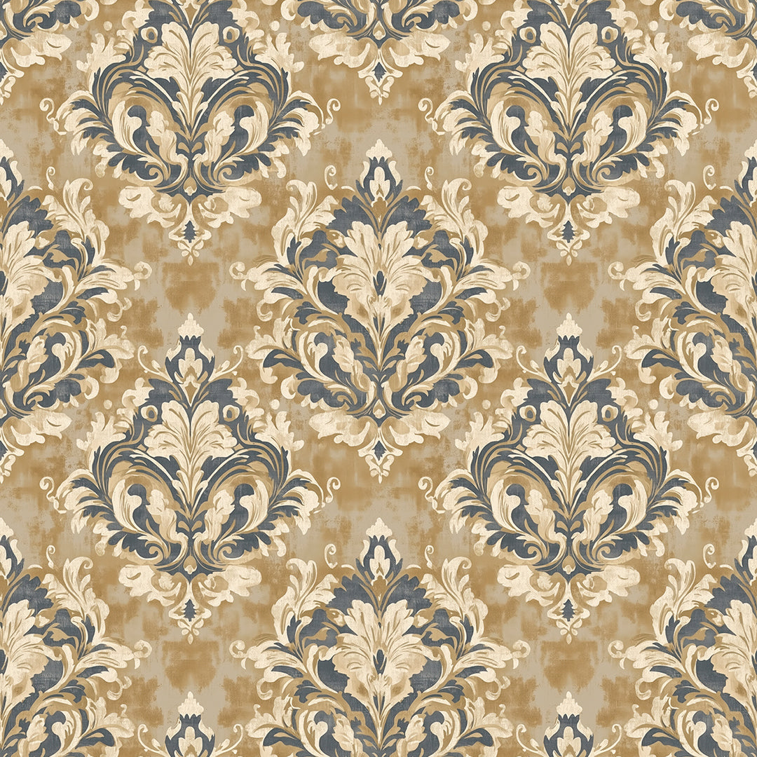 Evoke timeless elegance with this classic damask wallpaper. Its sophisticated palette of gilded beige and deep slate blue, set against a subtly distressed background, creates a sense of historic grandeur. Perfect for adding a touch of refined luxury to a living room, dining room, or study.