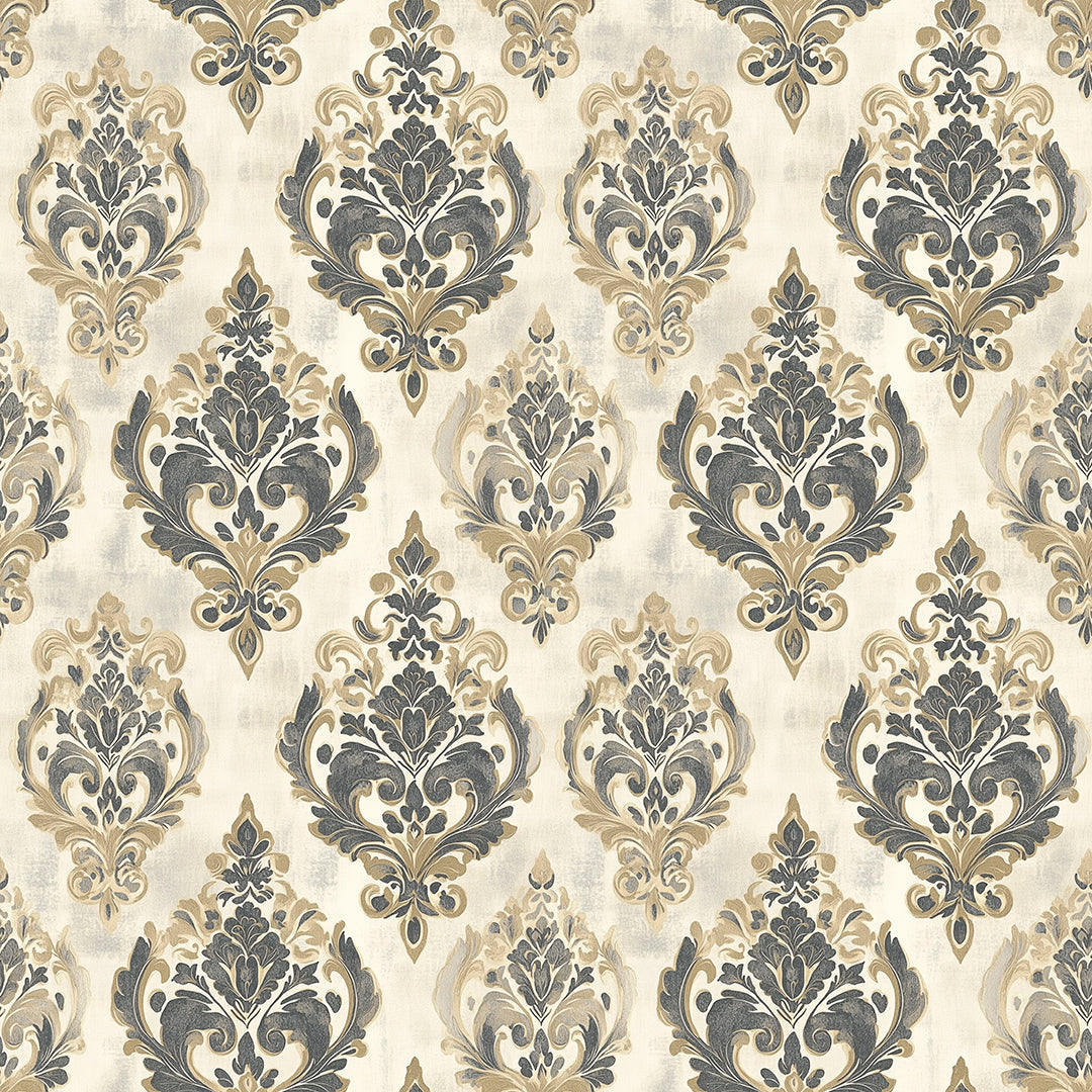 Evoke timeless grandeur with this sophisticated damask wallpaper. Intricate motifs in deep charcoal and muted gold create stately elegance against a weathered cream backdrop, making it perfect for a refined living room, dining room, or master bedroom.