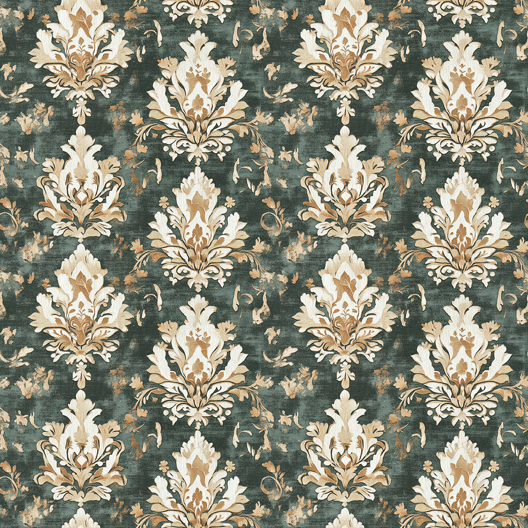 Invoke timeless elegance with this exquisite damask wallpaper, featuring intricate motifs in warm gold and cream set against a rich, distressed teal background. This design offers a sense of vintage luxury and dramatic depth, perfect for creating a sophisticated accent wall in a living room, dining room, or bedroom.