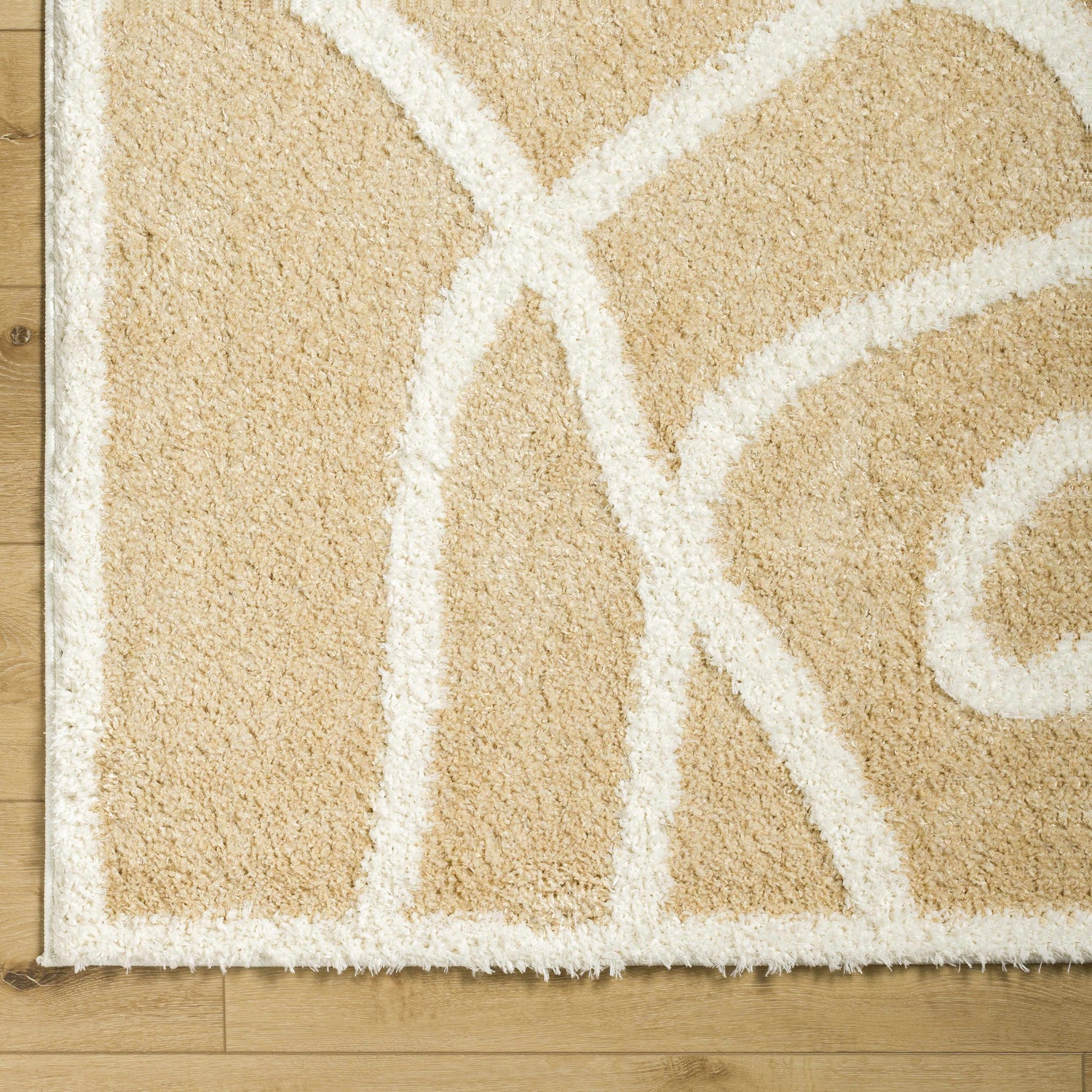 Flowing cream swirls drift across a warm camel background — the Gilon is a soft, plush statement rug that keeps things effortlessly modern and neutral.