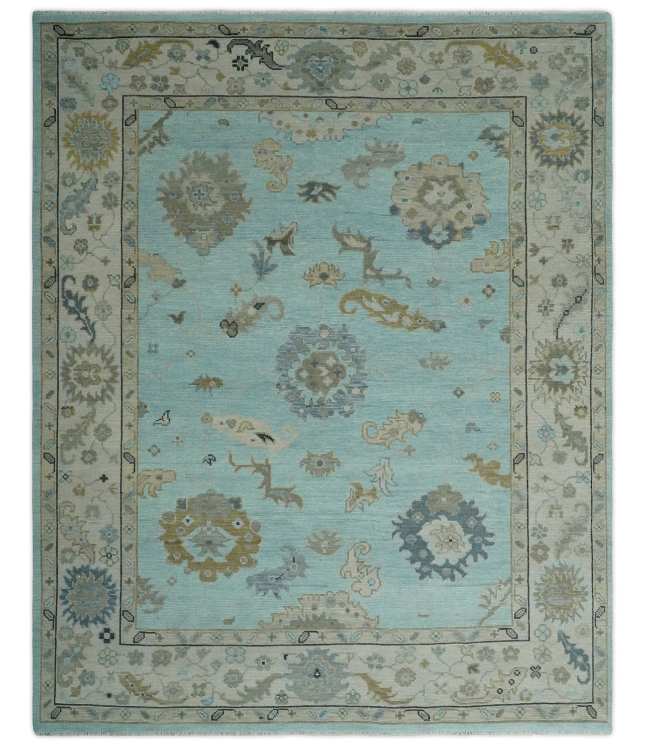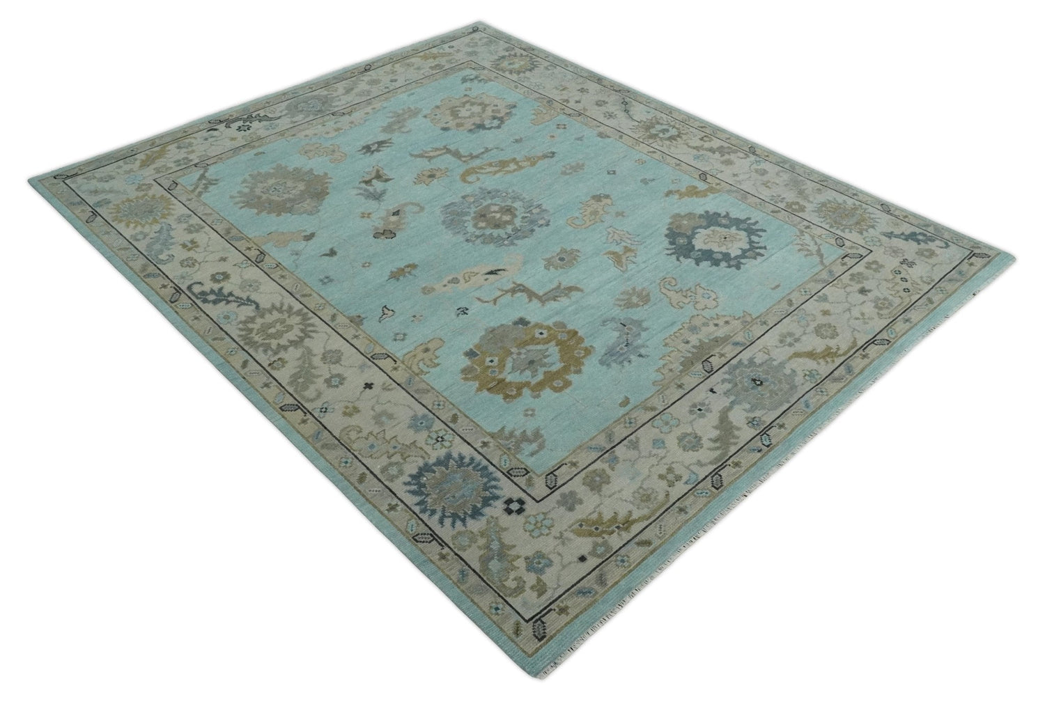 Hand Knotted Aqua, Beige and Ivory Traditional Oushak Wool Rug