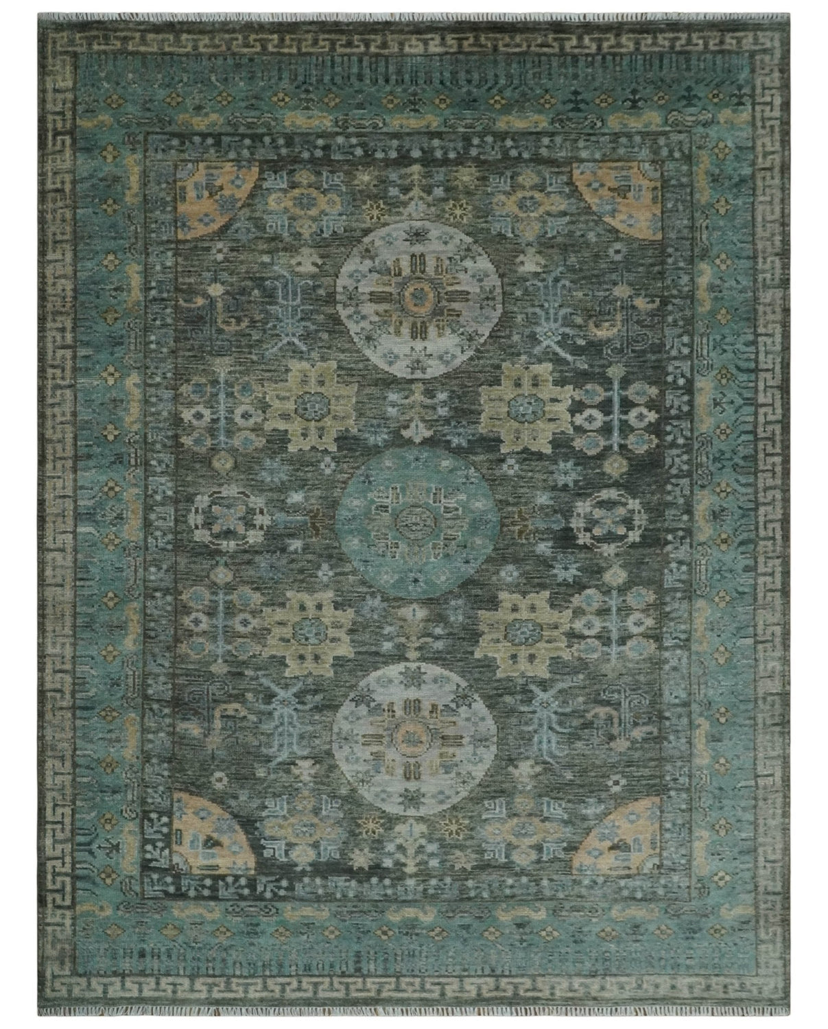 Hand Knotted Charcoal, and Aqua Oriental Khotan Multi Size Traditional Wool Area Rug
