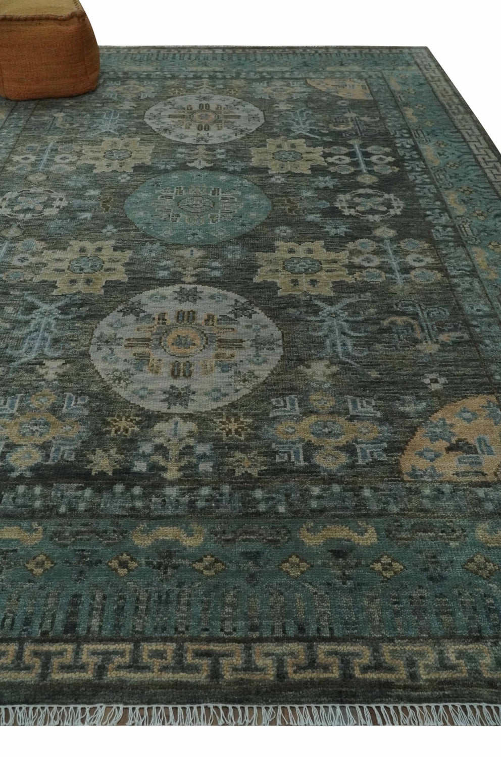 This luxurious custom made Hand Knotted Charcoal and Aqua Oriental Khotan Wool Area Rug is a timeless classic featuring an antique Khotan design. Crafted with the finest wool and hand-knotted for long-lasting quality, it will bring luxury and style to any room.