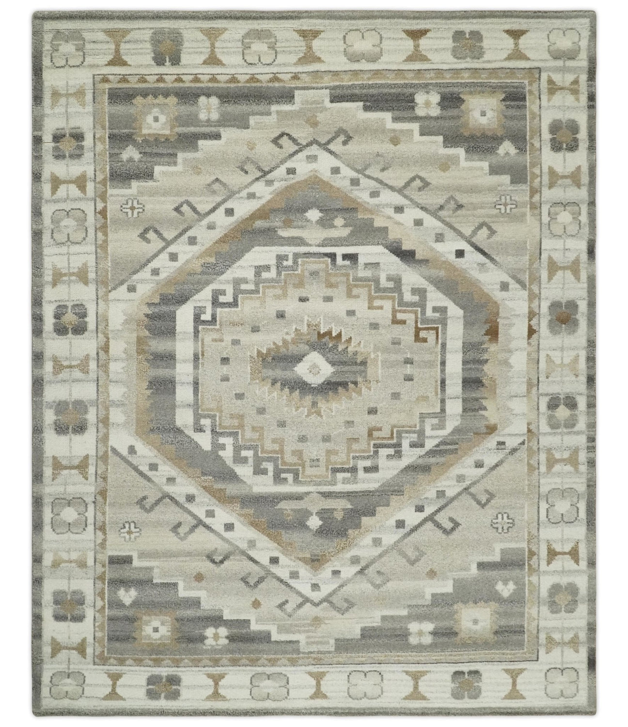 Hand Knotted Ivory, Charcoal and Beige Traditional Medallion Natural Wool Custom Made Area Rug, Kids, Living Room and Bedroom Rug