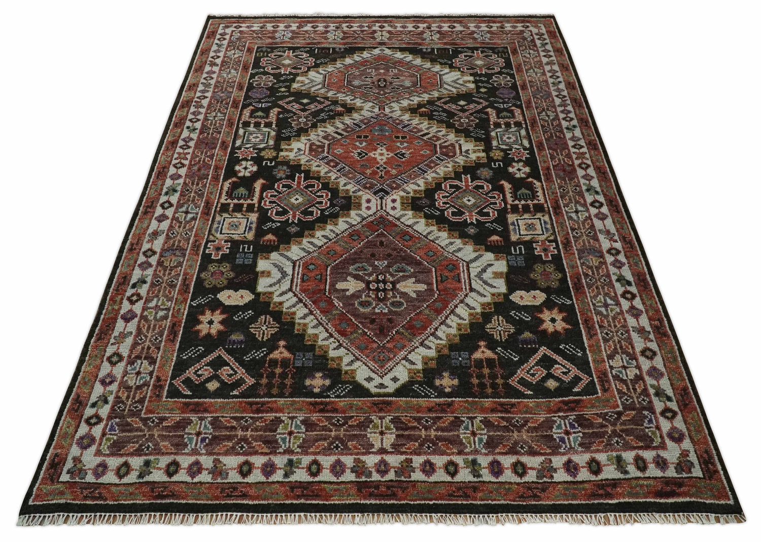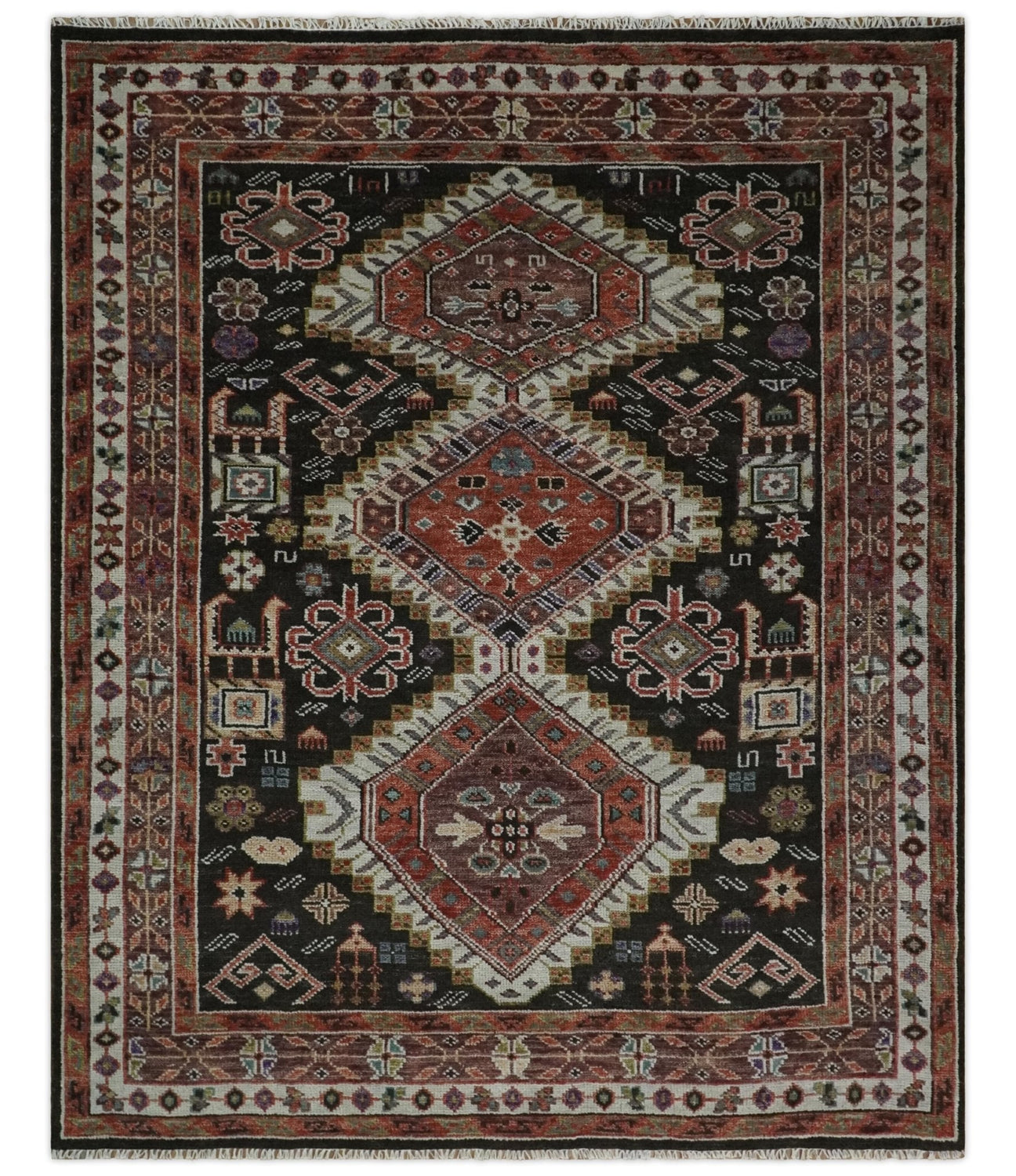 This Hand-Knotted Rust, Ivory and Black Wool Rug has been Made with Handspun Wool. The beautiful colors of the rug carry a legacy of the heirloom rug. The traditional design of the rug completes your space without making it look busy. Hand-Knotted rugs are durable and can last for decades if treated right.