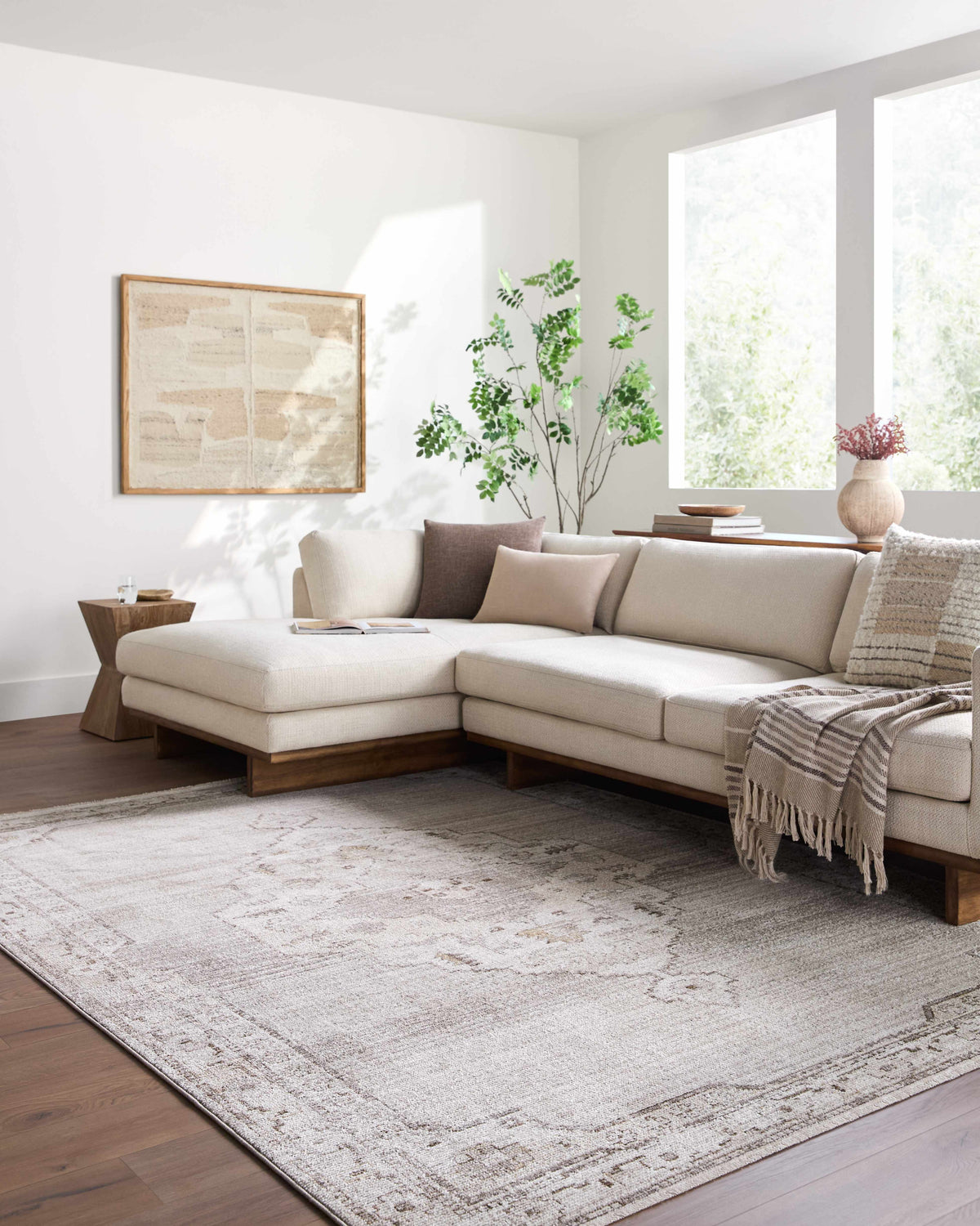 When selecting a living room rug, choose one that anchors your furniture by either placing all the legs on the rug or just the front legs, which helps define the seating area and enhances the room’s acoustics.