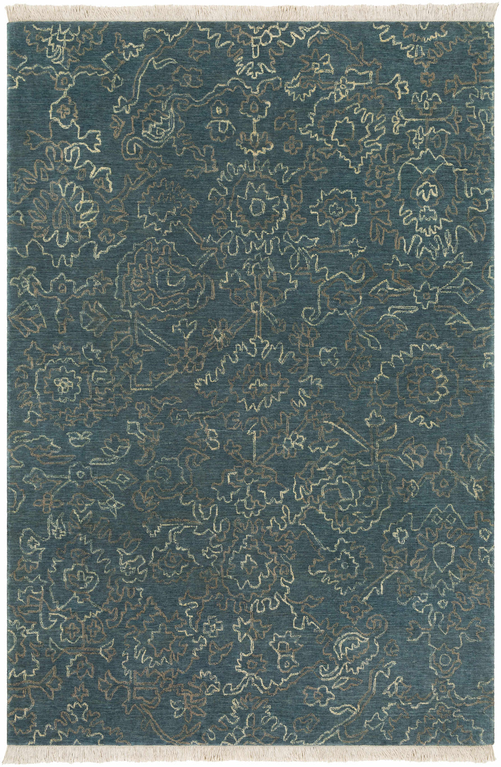 A richly patterned hand-knotted wool rug in deep teal with intricate traditional floral motifs and a classic ivory fringe — timeless style with real craftsmanship.
