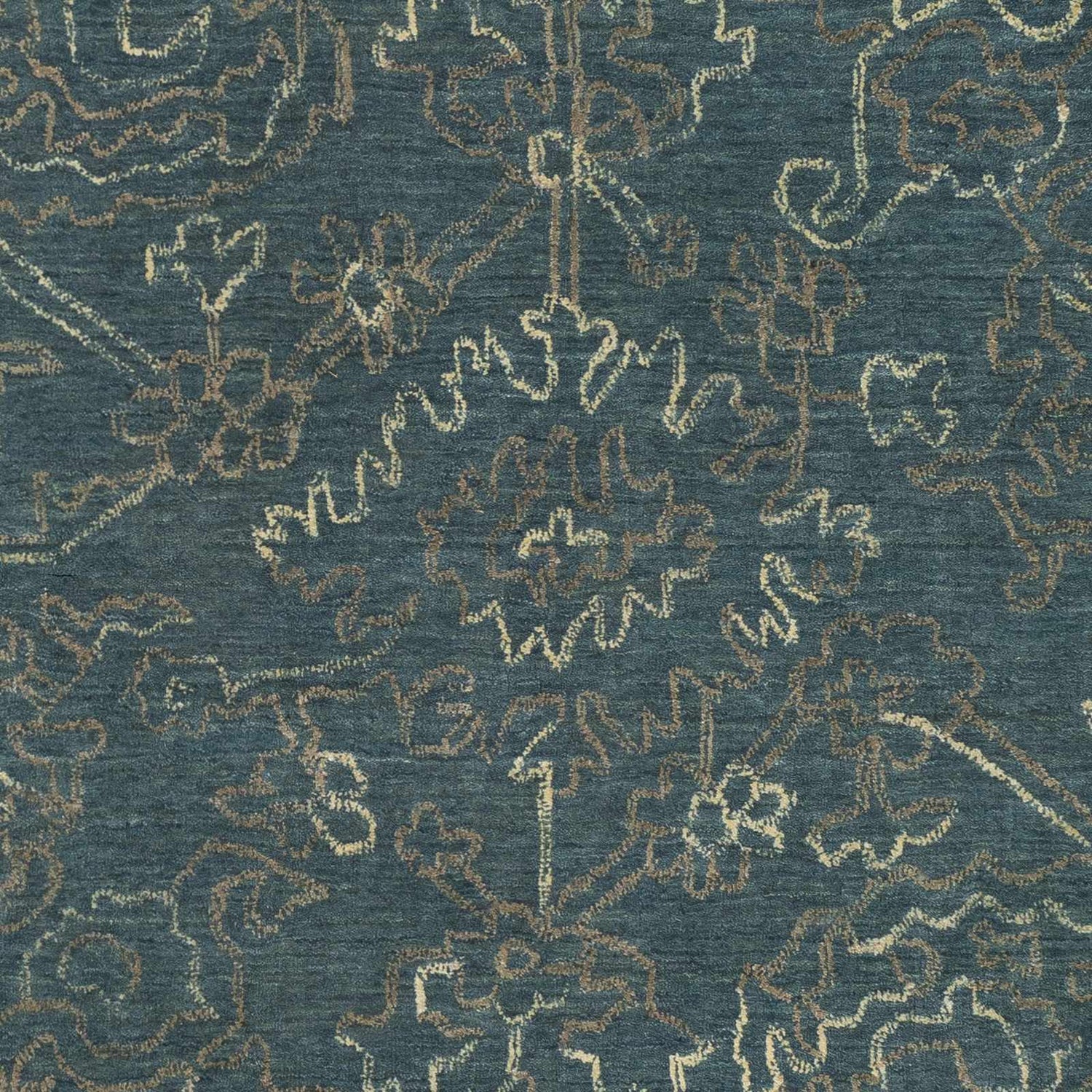 cool paletteA deep, saturated teal dominates the entire field, with the intricate floral motifs traced in muted olive green, warm brown, and soft beige — creating a tone-on-tone effect that feels rich and layered rather than busy.