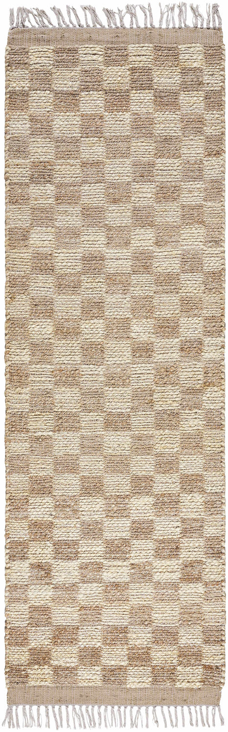 A handwoven jute rug with a warm beige and cream checkerboard pattern and fringe trim — natural texture meets farmhouse charm.