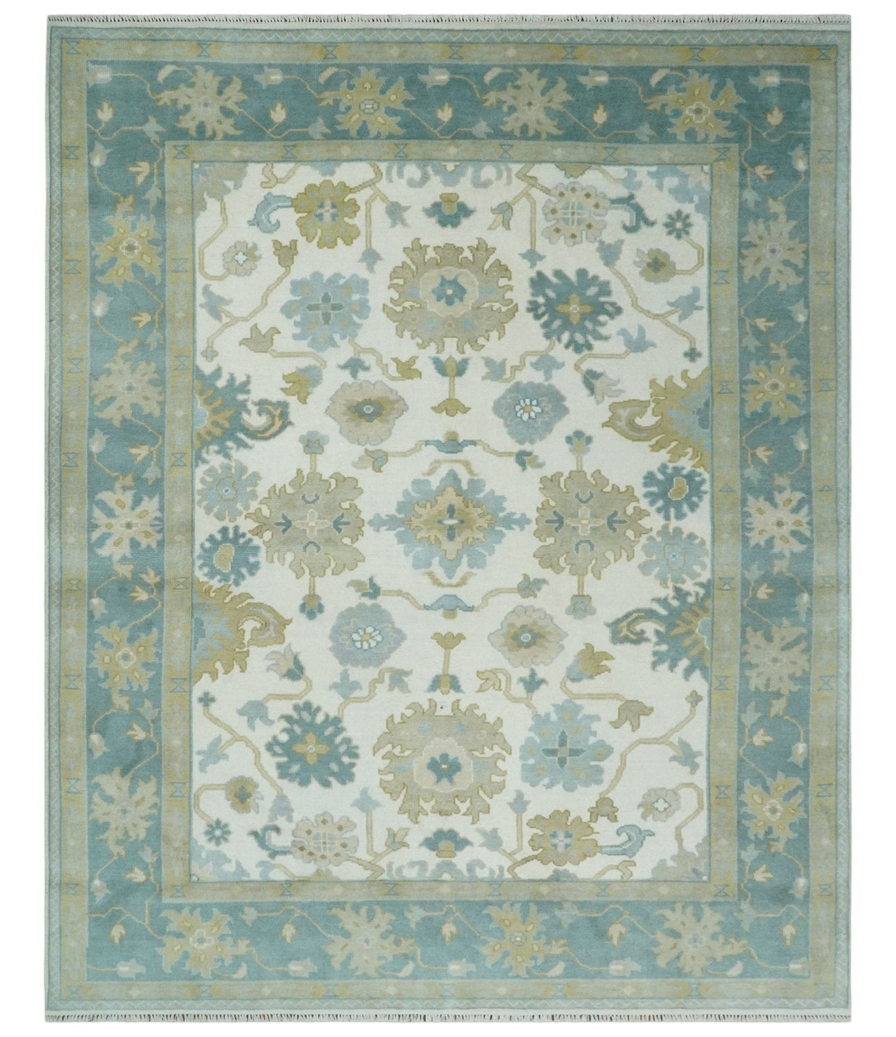 Ivory, Blue and Beige Floral Oushak Hand Knotted Traditional Turkish Inspired Custom Made Wool Area Rug