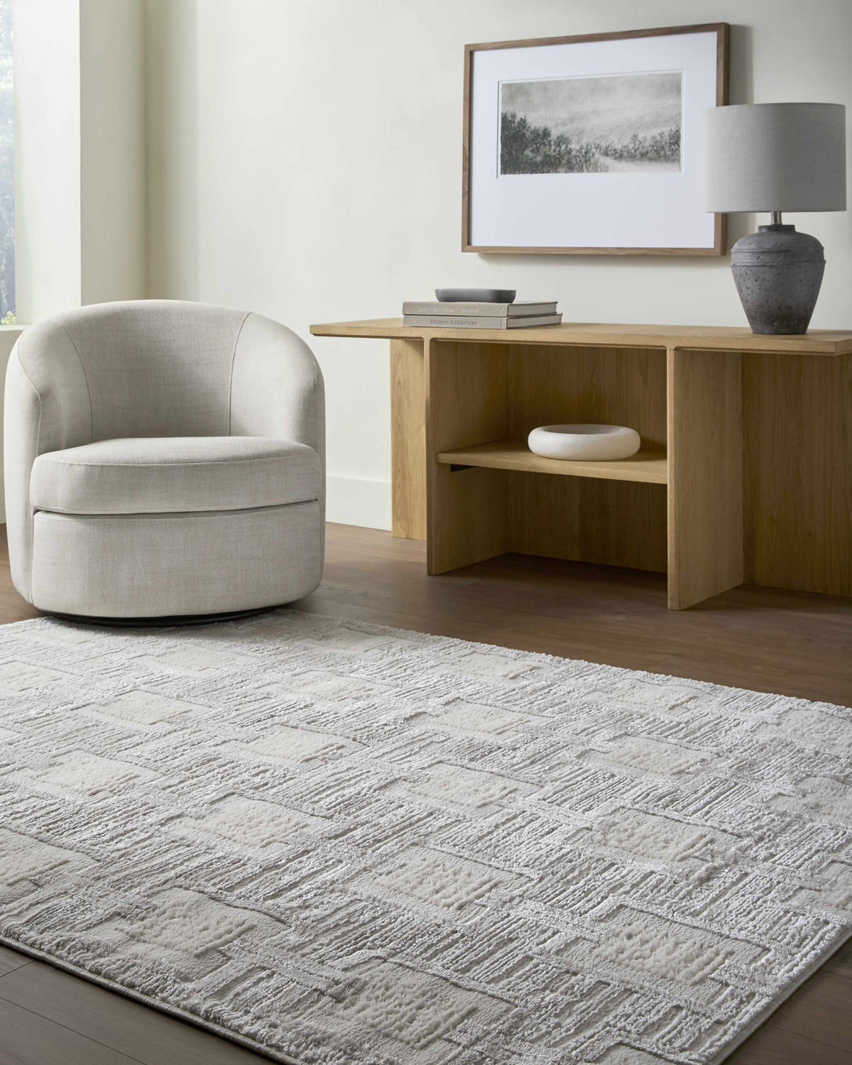 When selecting a living room rug, choose one that anchors your furniture by either placing all the legs on the rug or just the front legs, which helps define the seating area and enhances the room’s acoustics.