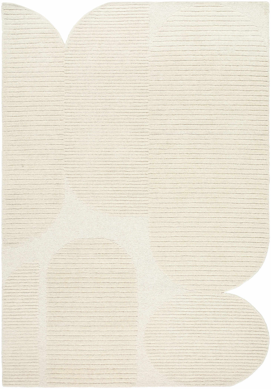 A tone-on-tone ivory wool rug with bold abstract shapes and rich ribbed texture — quietly sculptural, endlessly versatile.