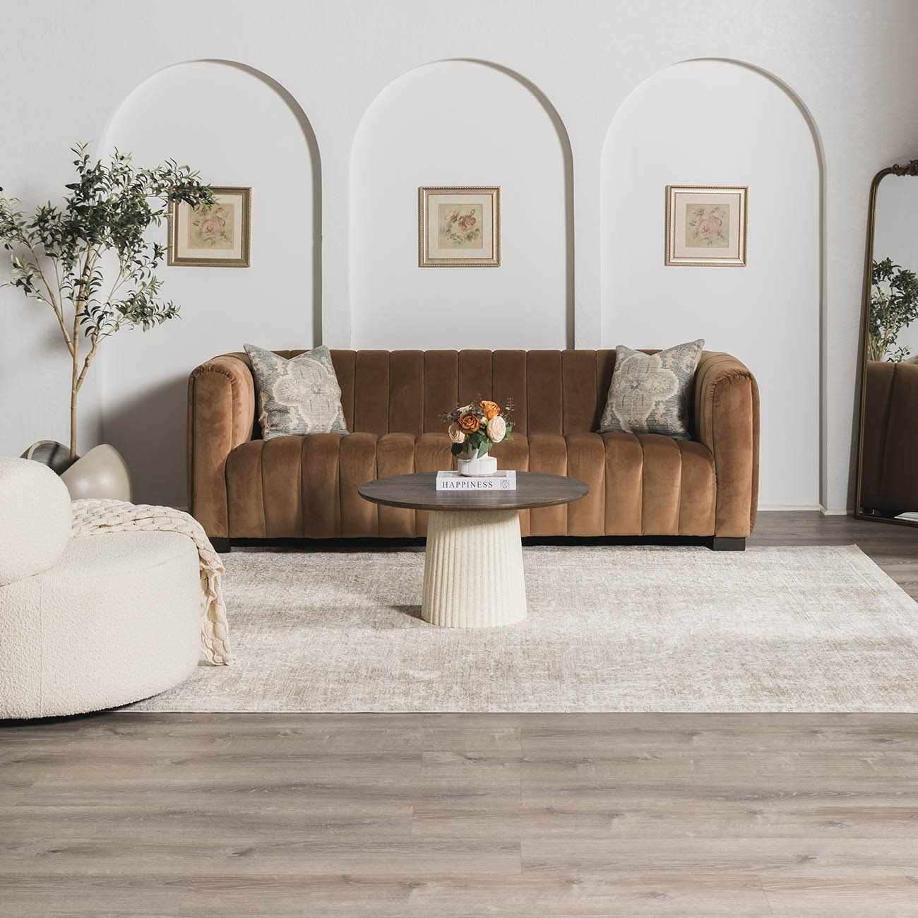 When selecting a living room rug, choose one that anchors your furniture by either placing all the legs on the rug or just the front legs, which helps define the seating area and enhances the room’s acoustics.