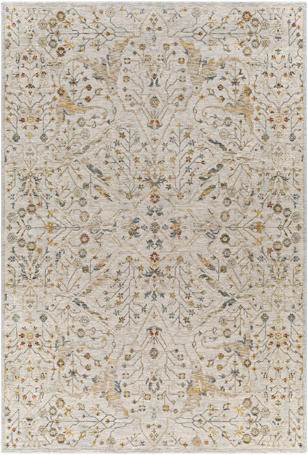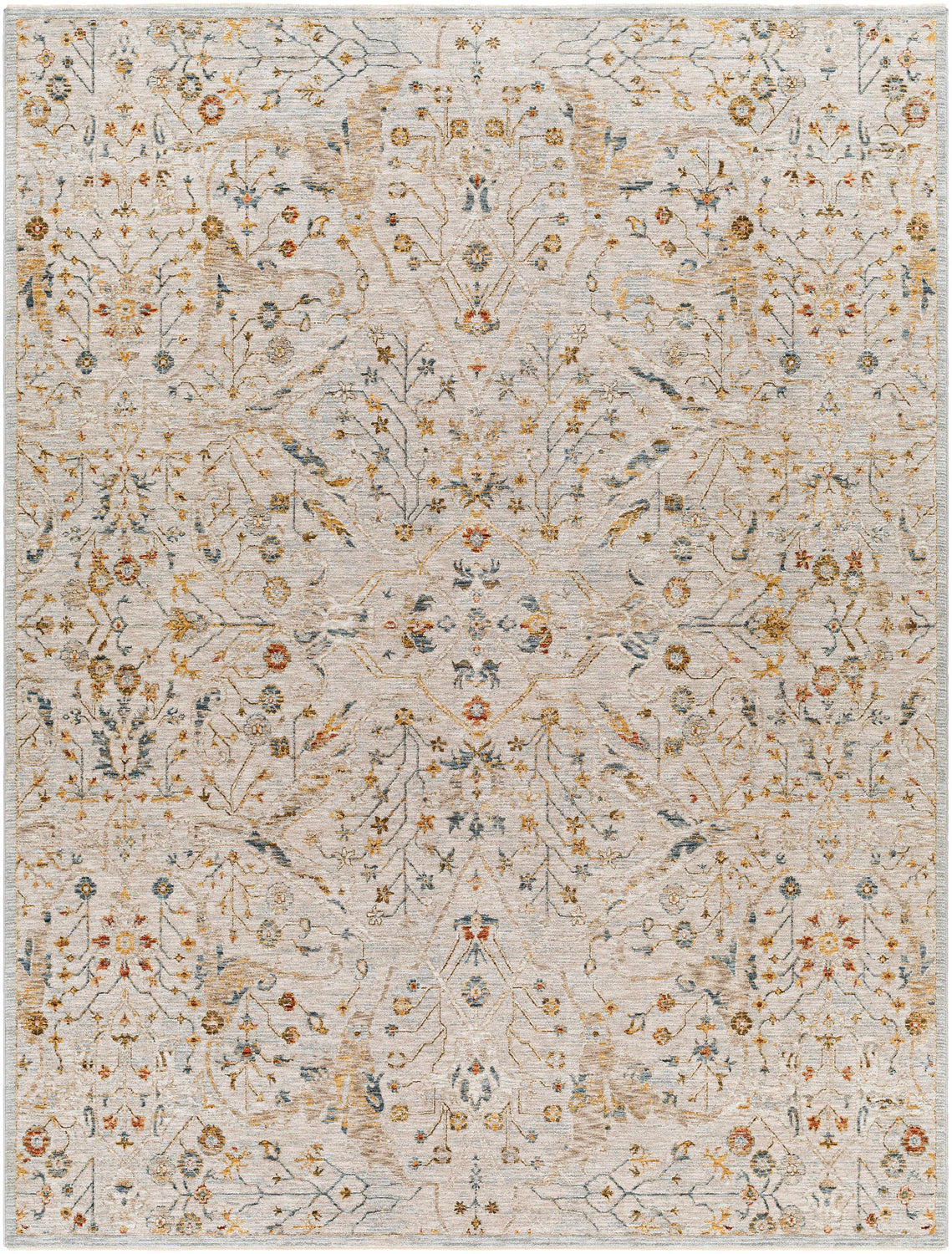 Revitalize your home's interior with the Kabungahan Oushak Style Floral Area Rug, an exquisite piece that exudes updated traditional style. Made in Turkey, this rug is machine woven from polyester, ensuring durability and longevity even in high traffic areas. The medium pile gives it a comfortable underfoot feel, while the fringe adds a charming touch of flair to its design. To maintain its beautiful appearance, spot clean with mild detergent as needed. We recommend using this rug with a pad for added comfort and protection. Step into comfort and timeless style with the Kabungahan Oushak Style Floral Area Rug!