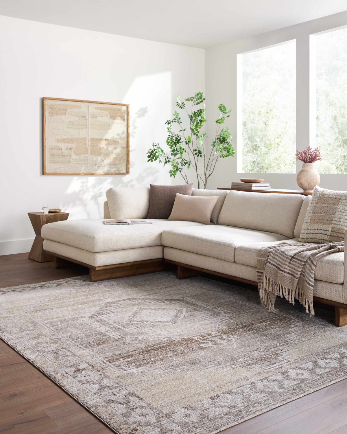 When selecting a living room rug, choose one that anchors your furniture by either placing all the legs on the rug or just the front legs, which helps define the seating area and enhances the room’s acoustics.