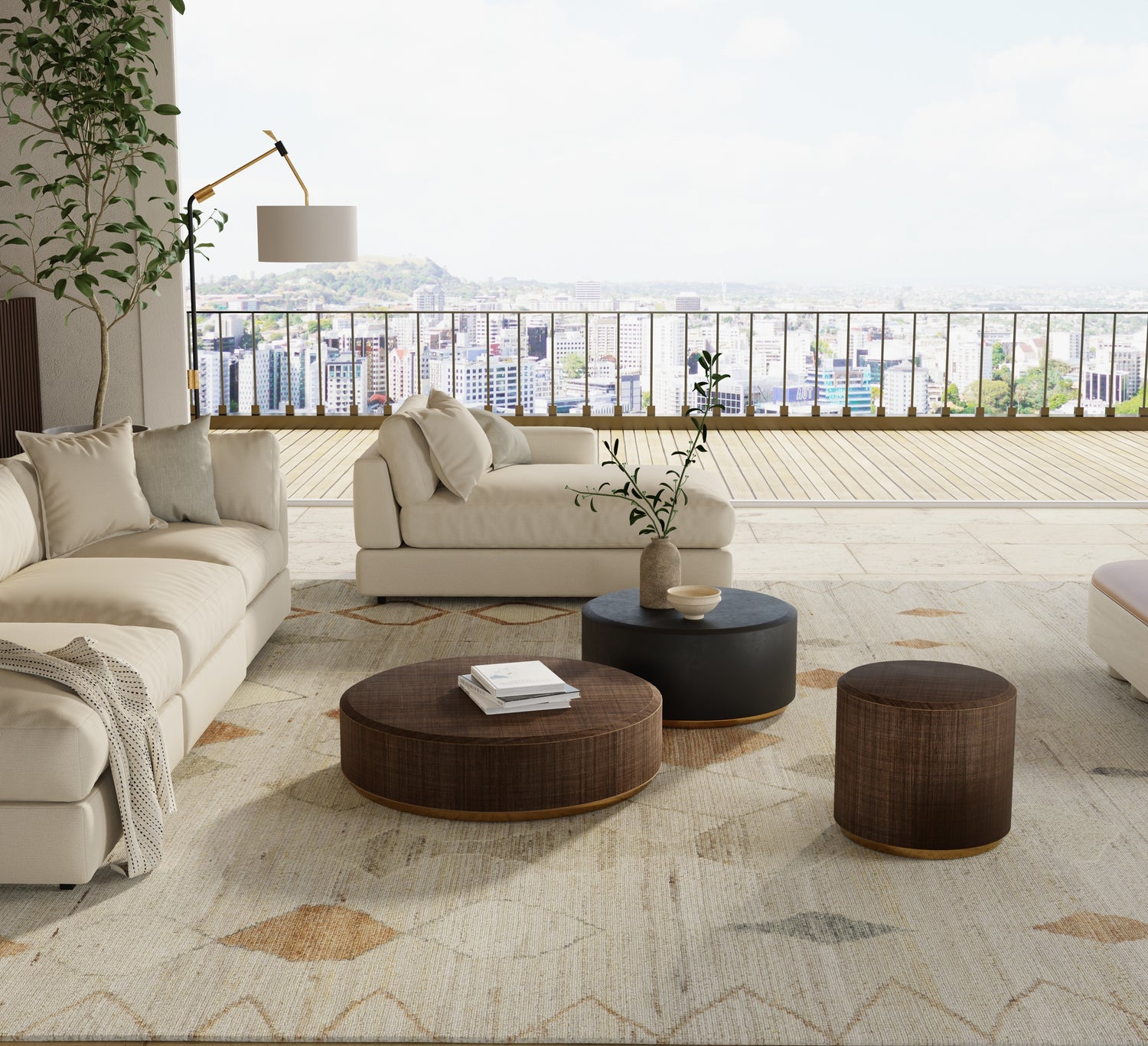 When selecting a living room rug, choose one that anchors your furniture by either placing all the legs on the rug or just the front legs, which helps define the seating area and enhances the room’s acoustics.