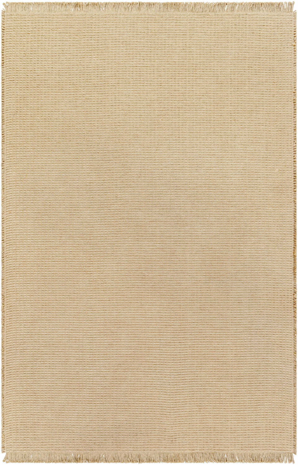 A rectangular flatweave area rug in warm sandy beige and golden tan tones, with a subtle woven texture visible across the entire surface — fine horizontal and vertical thread lines create a quiet, understated grid-like weave pattern. The color is nearly solid, shifting gently between light beige and warm tan depending on the light, with no bold pattern or motif. The edges along the short sides feature short, neat cream-colored fringe approximately 1.75 inches long. The rug is low-profile and flat, with a smooth but textured surface. Overall impression: a calm, natural, minimalist flatweave with an organic warmth.