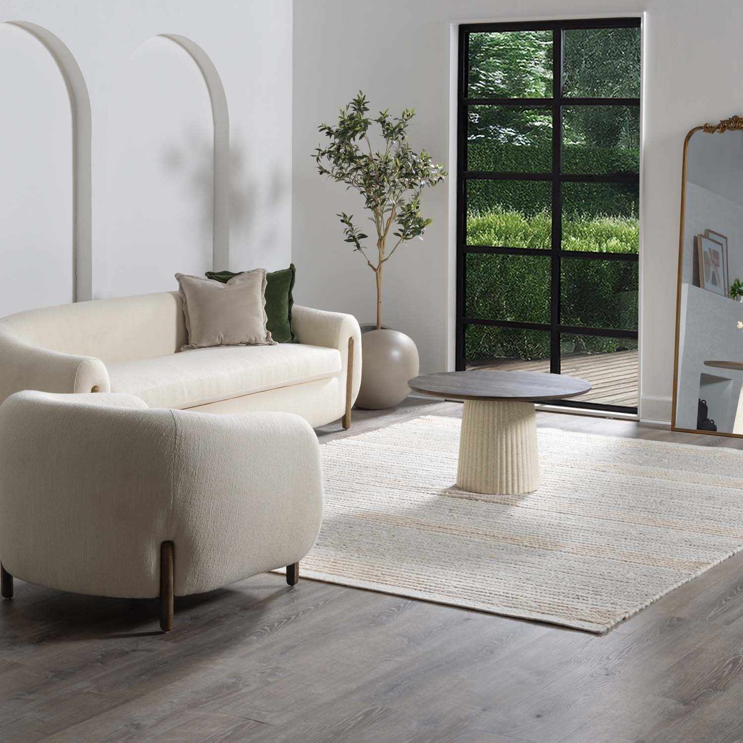 When selecting a living room rug, choose one that anchors your furniture by either placing all the legs on the rug or just the front legs, which helps define the seating area and enhances the room’s acoustics.