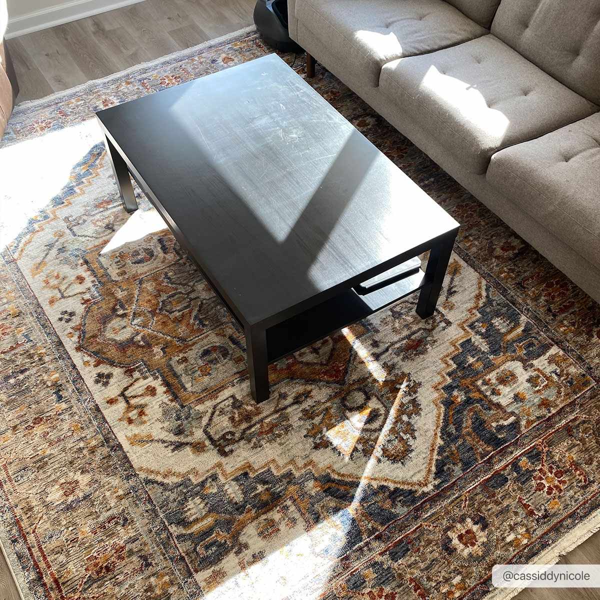 When selecting a living room rug, choose one that anchors your furniture by either placing all the legs on the rug or just the front legs, which helps define the seating area and enhances the room’s acoustics.