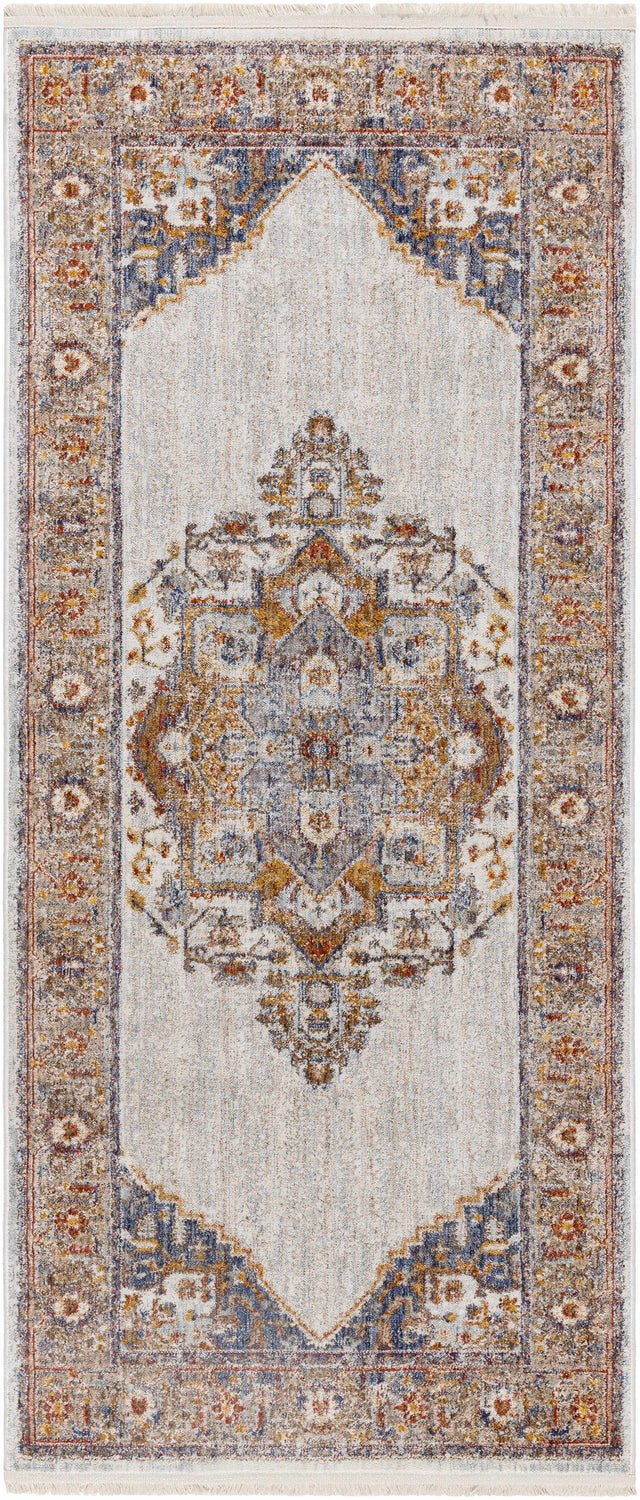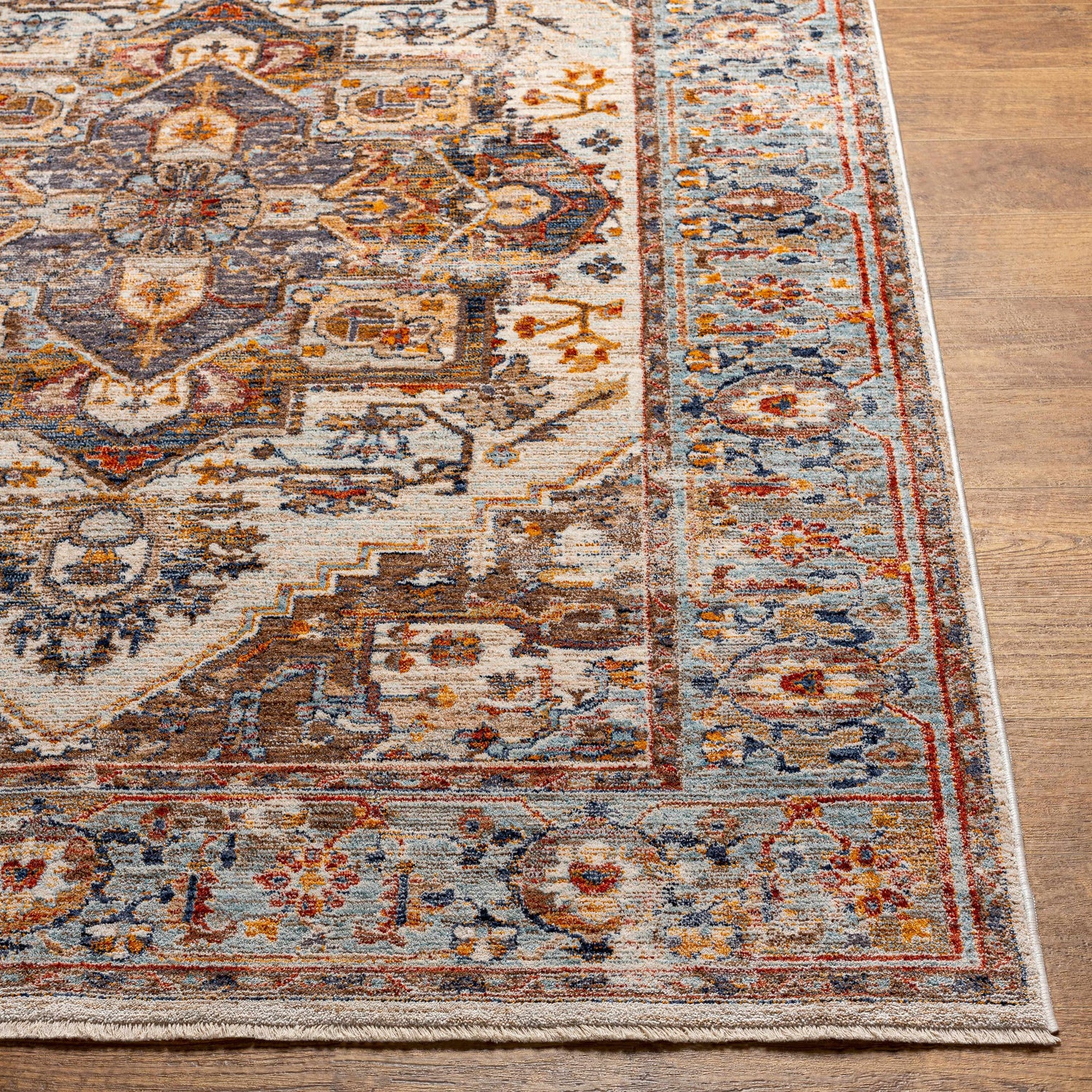 A richly detailed Persian medallion design in warm browns, cream, and blue — machine woven for durability with an heirloom look that fits any traditional or transitional space.
