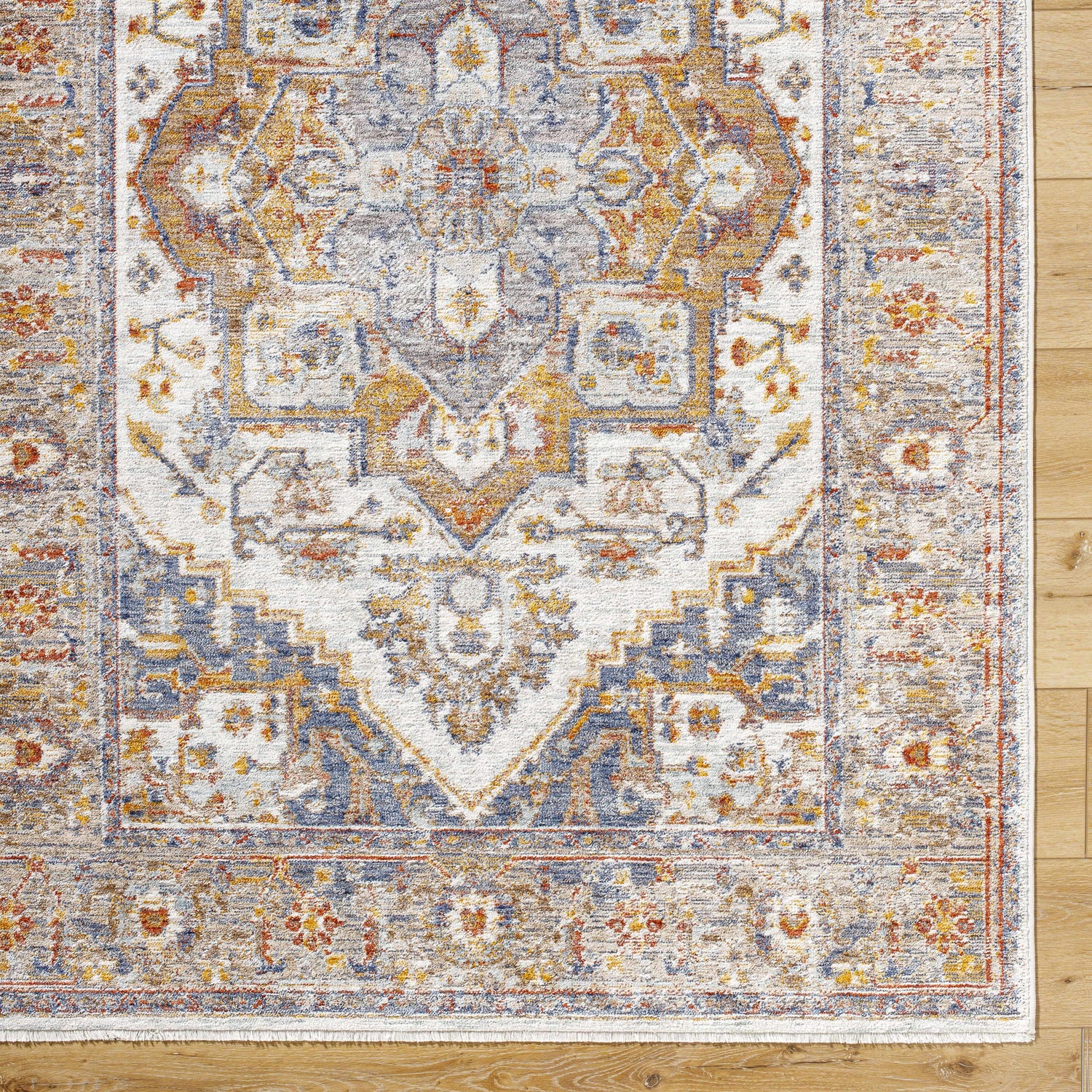 • Detailed Araya Area Rug in beige, bone, cloud gray, and muted blue. Traditional floral pattern, machine woven polyester. Design-Rectangle-537 Home office with Araya Area Rug in beige, bone, and muted blue. Traditional rug under desk and chair on wood floor. Roomscene-Rectangle