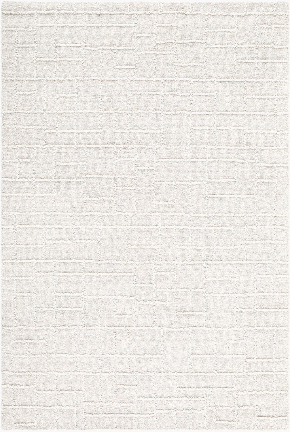 A serene, tone-on-tone white geometric rug that adds texture without noise — the perfect minimalist foundation for any modern space.