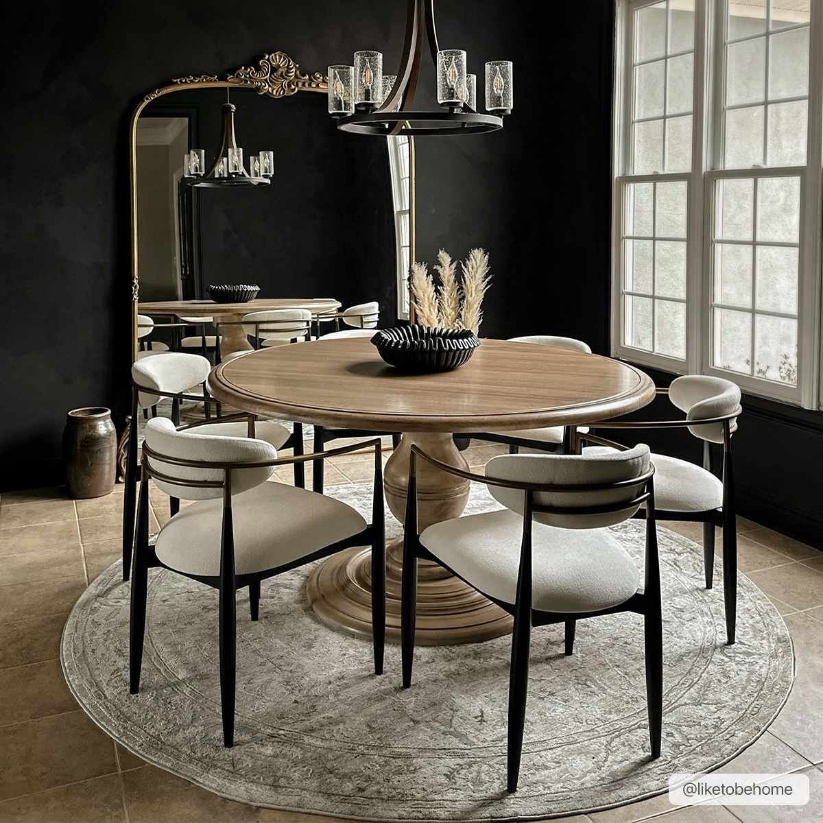 When selecting a dining room rug, choose one large enough to fit under the table and chairs, ensuring that when the chairs are pulled out, they remain on the rug for a balanced look.