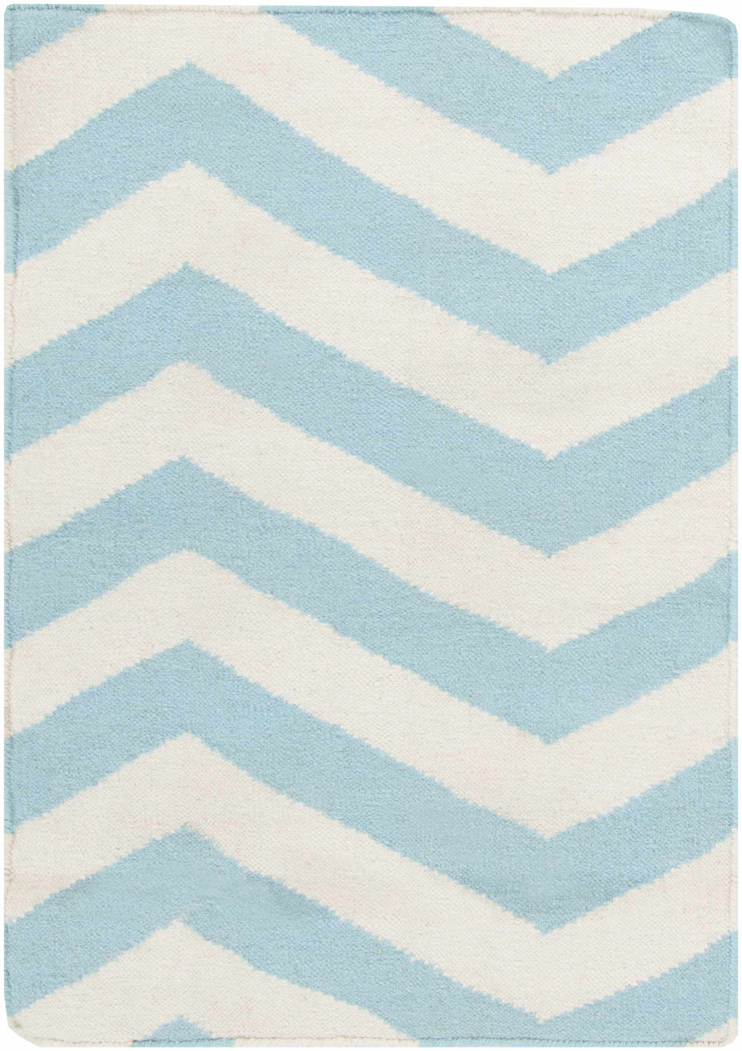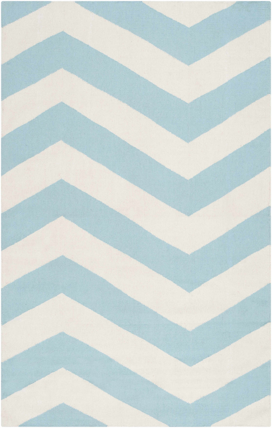 cool paletteA clean, equal split between soft sky blue and crisp white — the two colors alternate in bold chevron bands across the entire rug, creating a fresh, airy palette that feels both modern and coastal.
