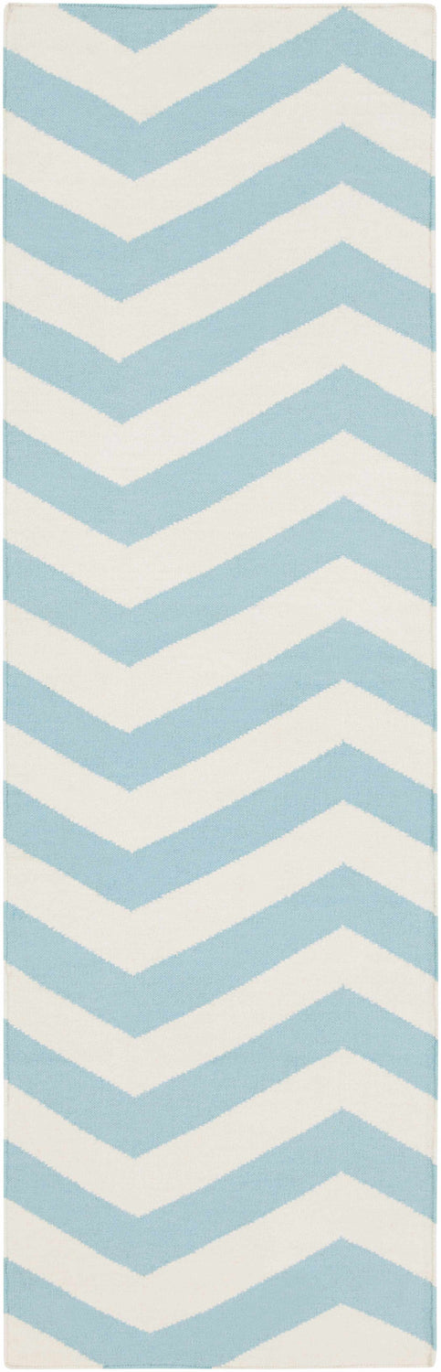 A crisp light blue and white chevron pattern hand woven in 100% wool — the Lerona brings modern geometric style and lasting durability to any room.