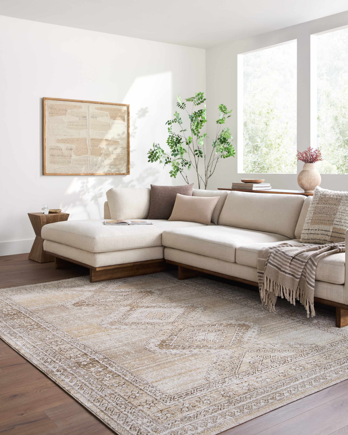 When selecting a living room rug, choose one that anchors your furniture by either placing all the legs on the rug or just the front legs, which helps define the seating area and enhances the room’s acoustics.