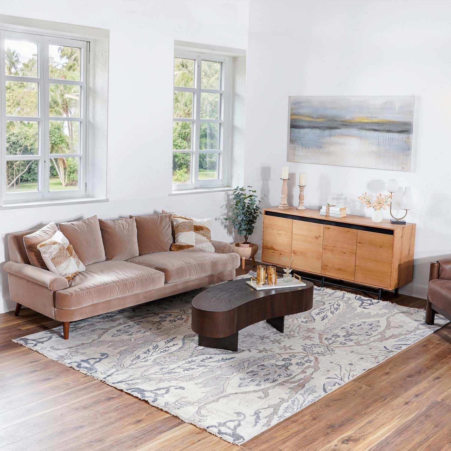 When selecting a living room rug, choose one that anchors your furniture by either placing all the legs on the rug or just the front legs, which helps define the seating area and enhances the room’s acoustics.