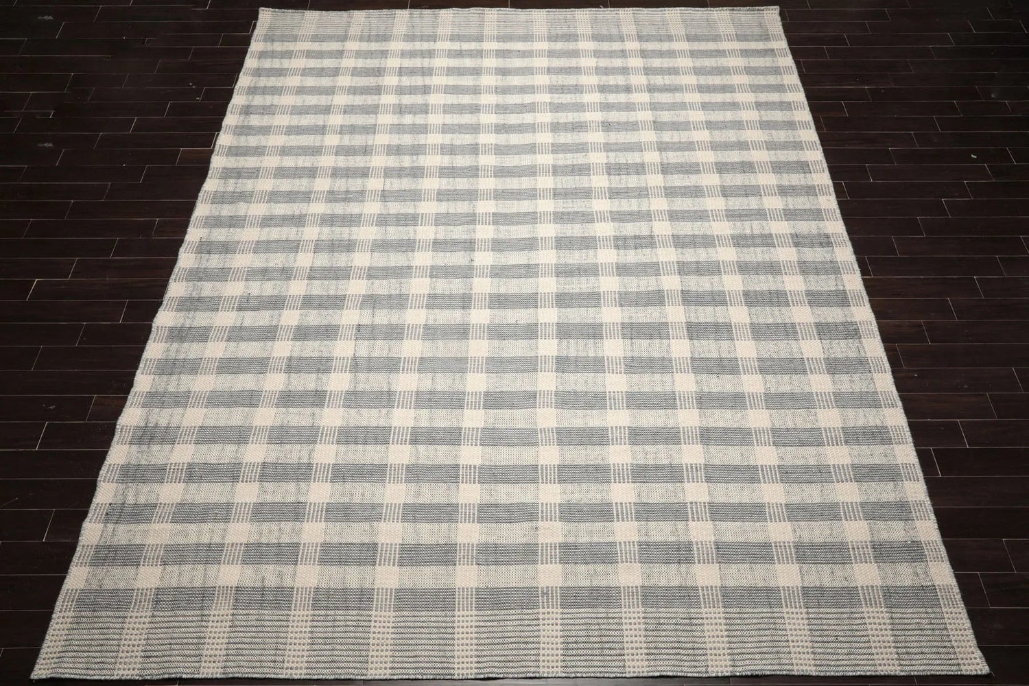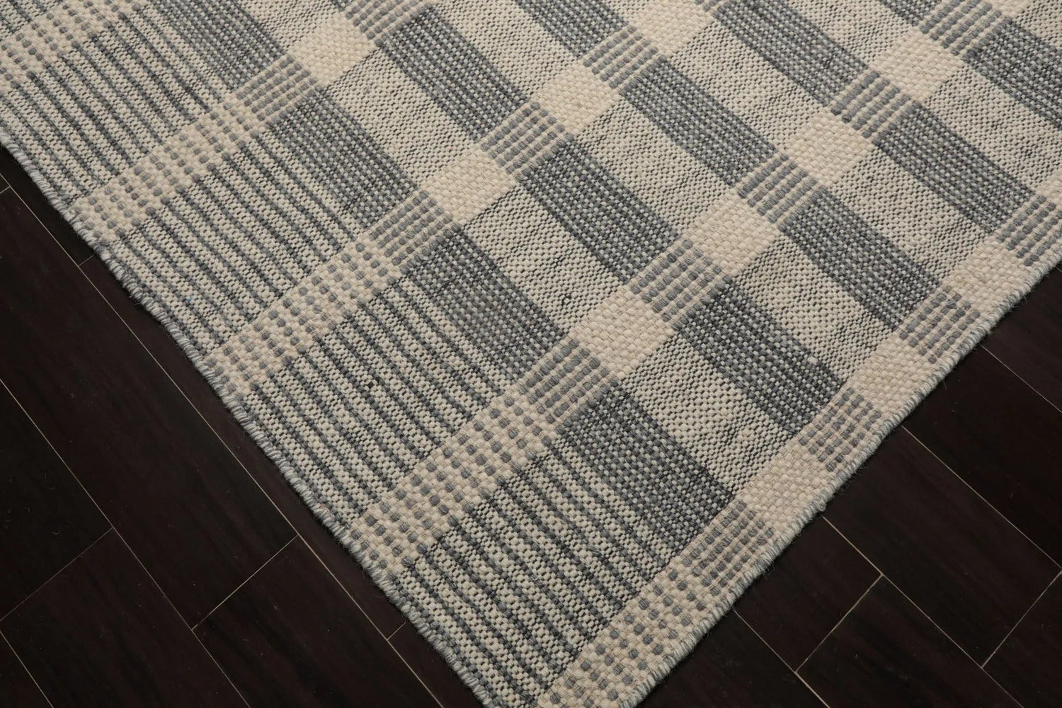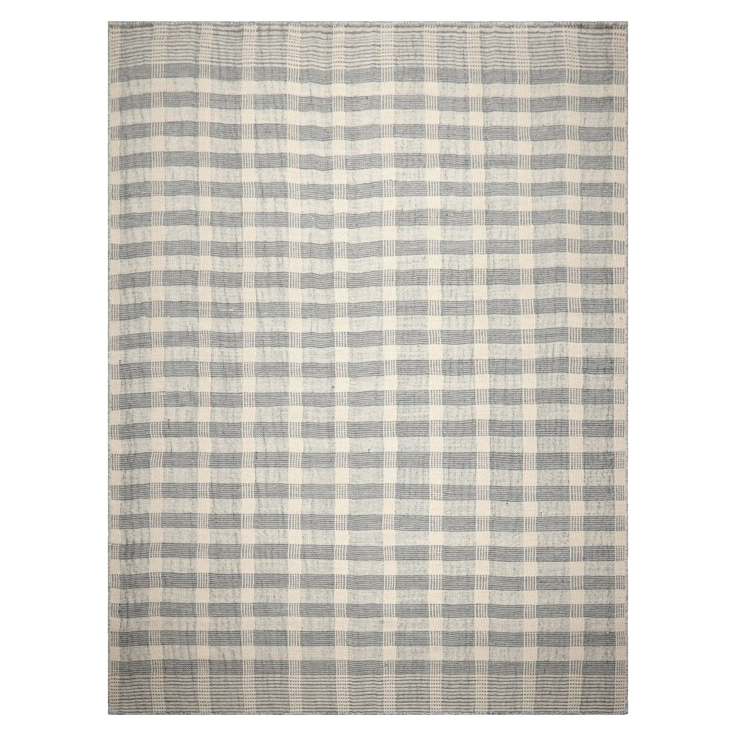The loomBloom handwoven plaid flatweave rug, expertly crafted in India from 100% premium wool, seamlessly blends traditional plaid patterns with modern aesthetics. Featuring a low-profile flatweave design, it is reversible, ensuring both durability and easy maintenance. The harmonious color palette of ivory, gray and black brings a sense of calm and refinement, making it suitable for a variety of spaces, from living rooms to bedrooms. With artisanal craftsmanship that guarantees softness and resilience, this rug is ideal for high-traffic areas. Its timeless design complements both classic and contemporary interiors, enhancing any room with its stylish and practical appeal.