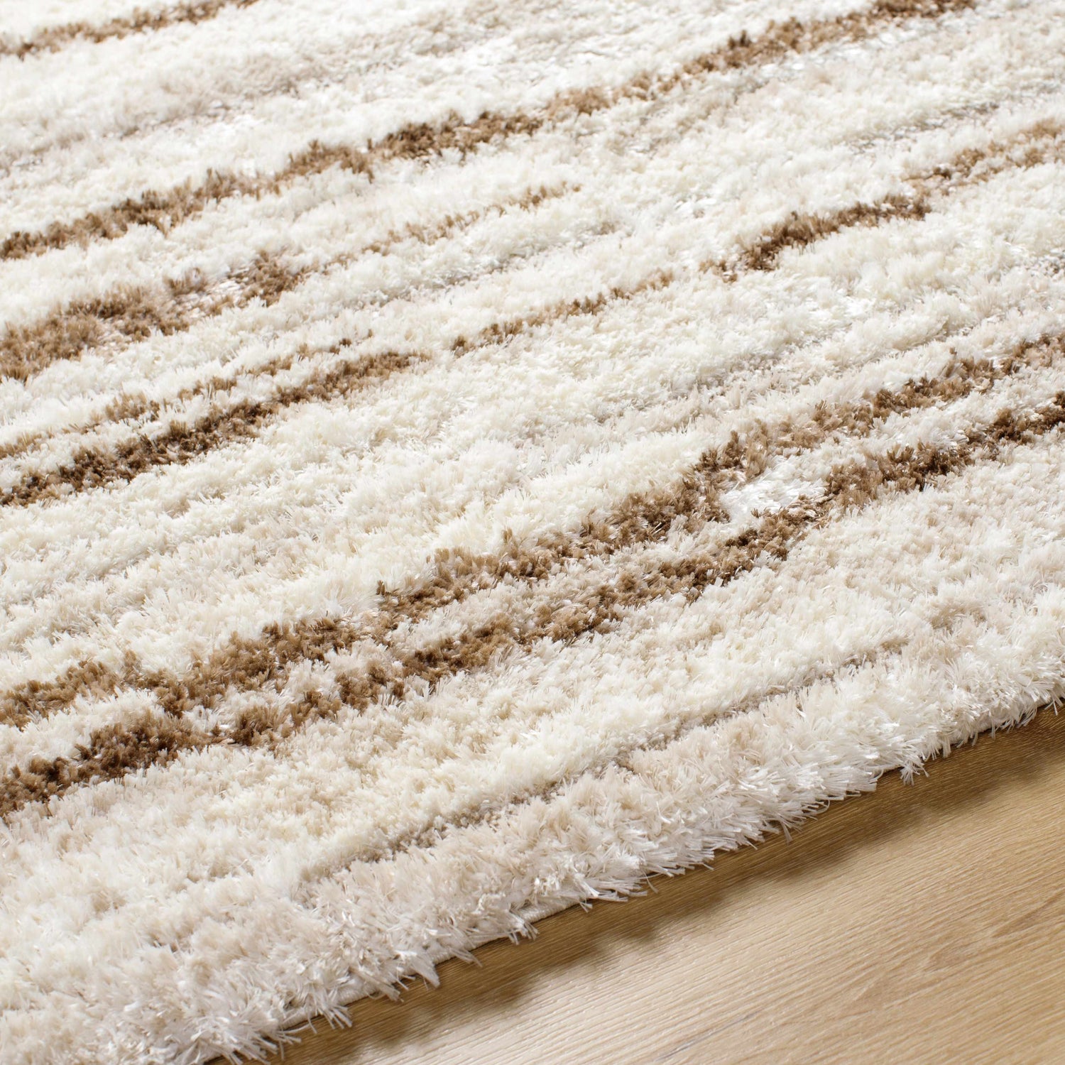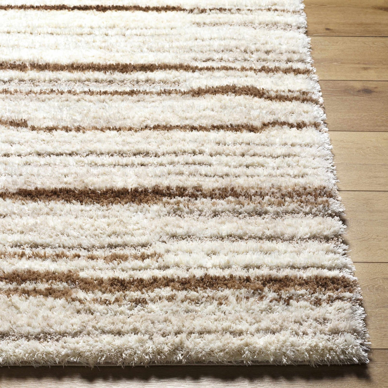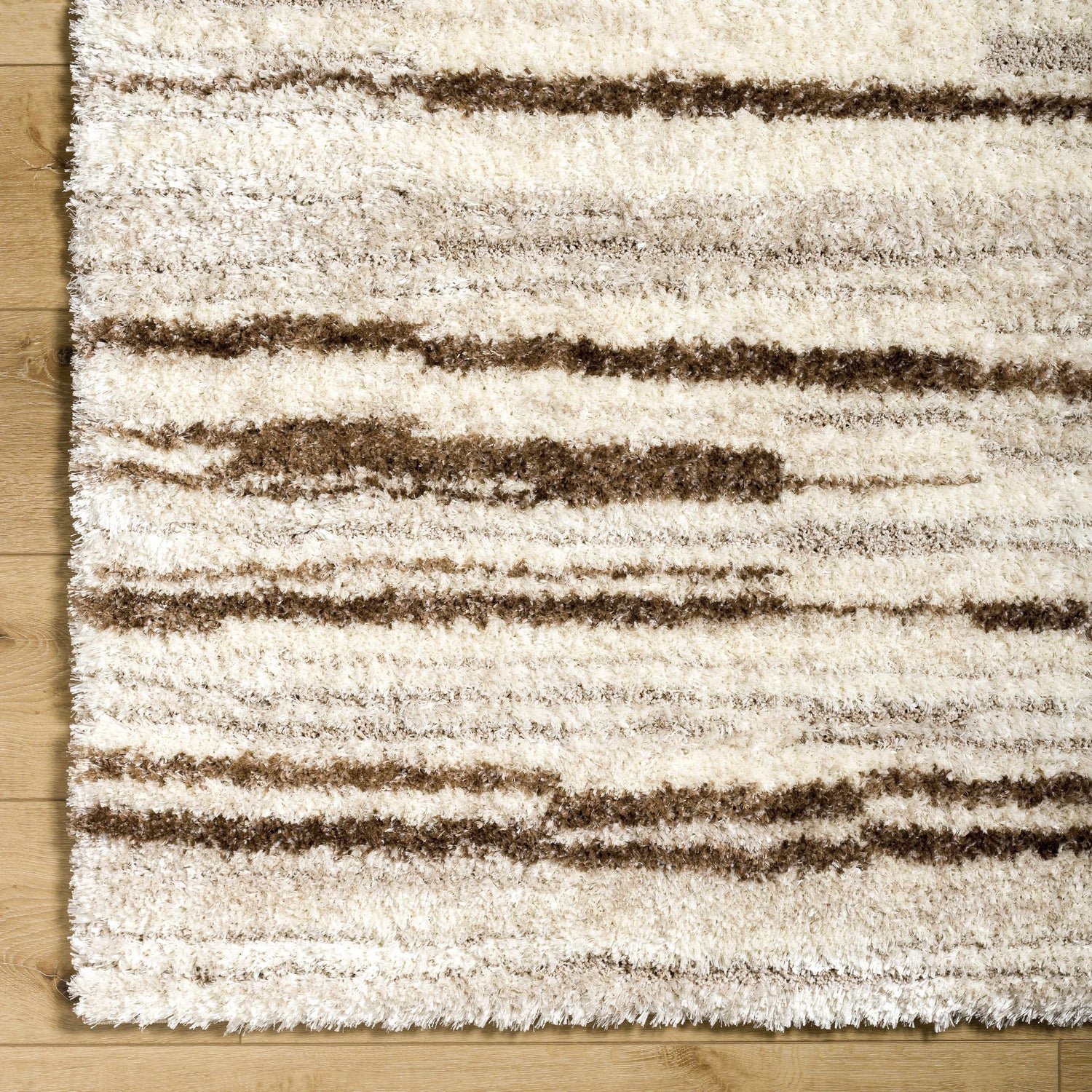 Soft, plush, and effortlessly neutral — the Maho's broken stripe shag design in ivory, cream, and warm brown adds cozy texture to any modern space.