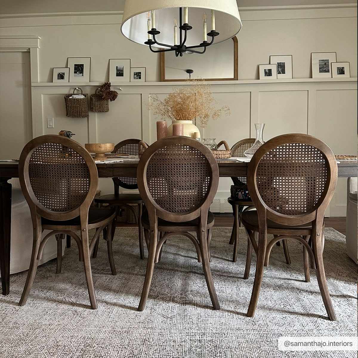 When selecting a dining room rug, choose one large enough to fit under the table and chairs, ensuring that when the chairs are pulled out, they remain on the rug for a balanced look.