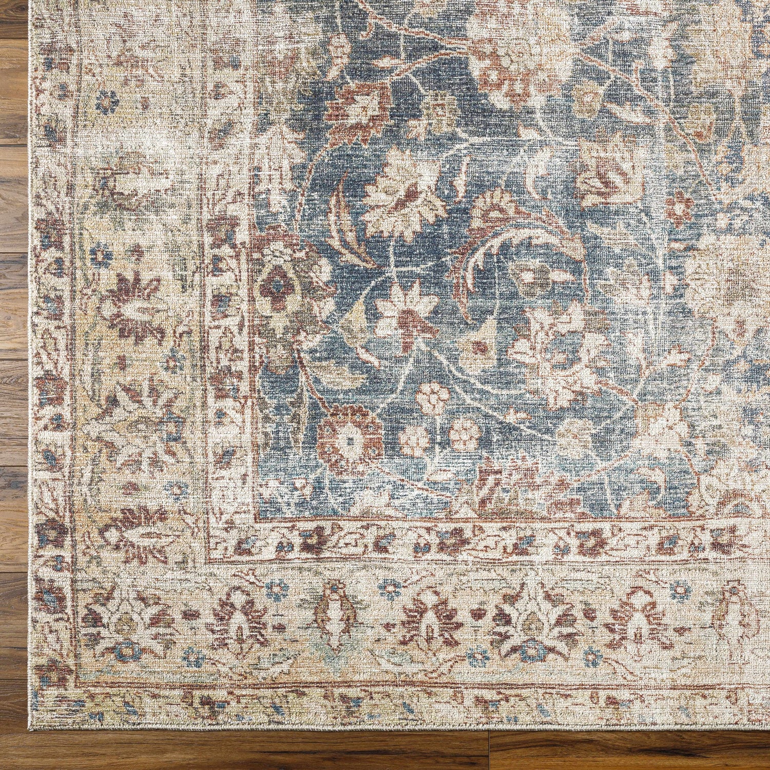 cool paletteA deep slate blue base fills the field, layered with warm beige and cream floral scrollwork, accented by touches of rust, brown, and subtle green — the overall palette feels like a well-loved antique rug with rich, complex tones that deepen in person.