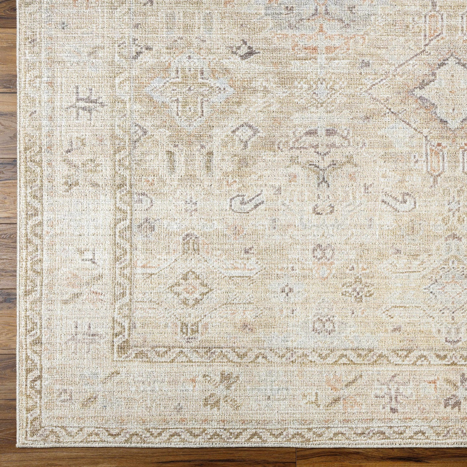 warm paletteA warm, sun-washed beige dominates the field, layered with golden tan and soft cream tones that give the rug an airy, antique feel. Subtle accents of dusty blue and muted rust appear throughout the medallion motifs, adding just enough contrast to keep the palette lively without disrupting its quiet, earthy harmony.