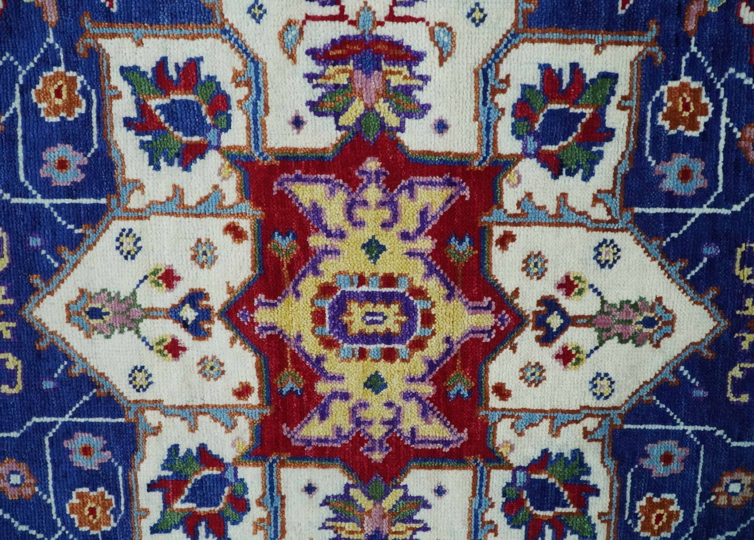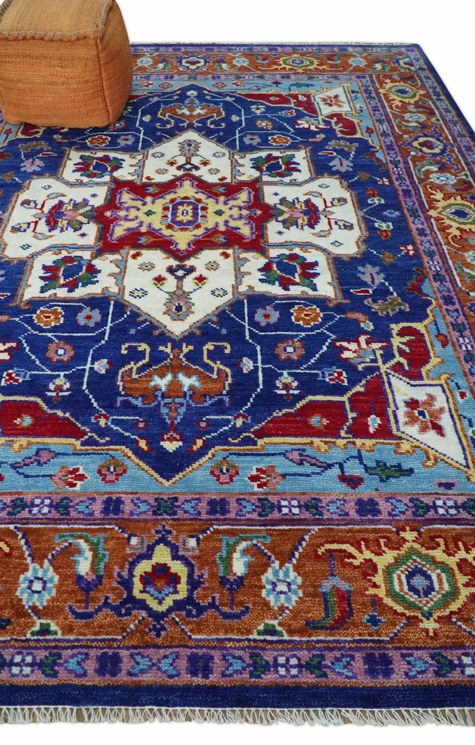 Maroon, Ivory, Blue and Rust Hand Knotted Traditional Heriz Multi Size wool Area Rug