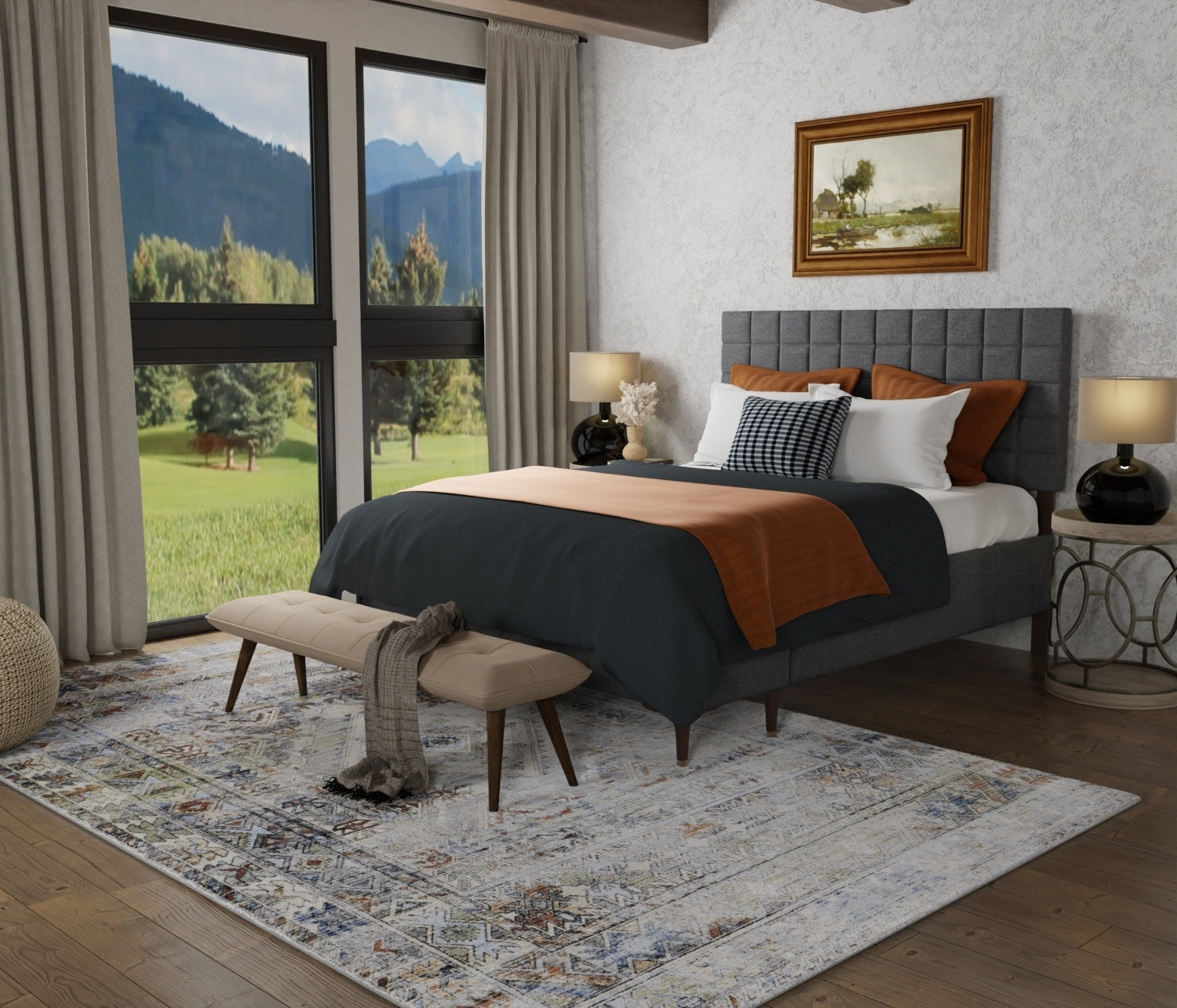 In the bedroom, opt for a rug that extends under the bed, providing a soft surface to step onto when getting out of bed and creating a cozy atmosphere.