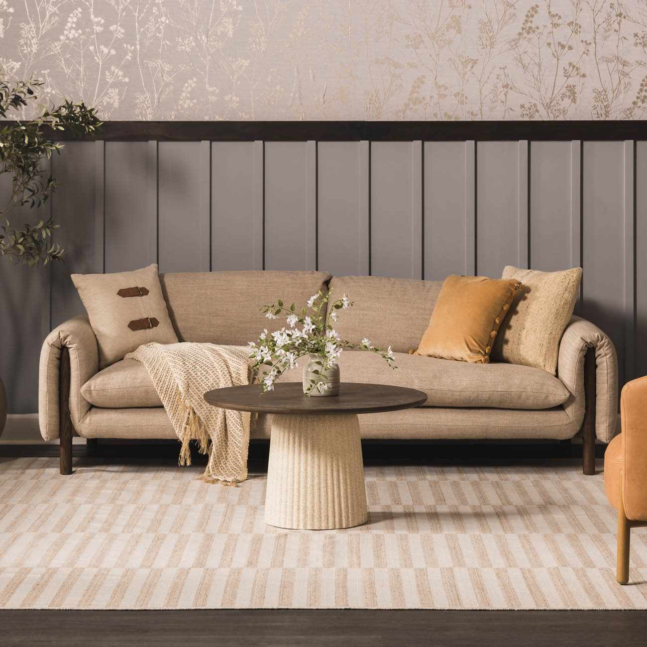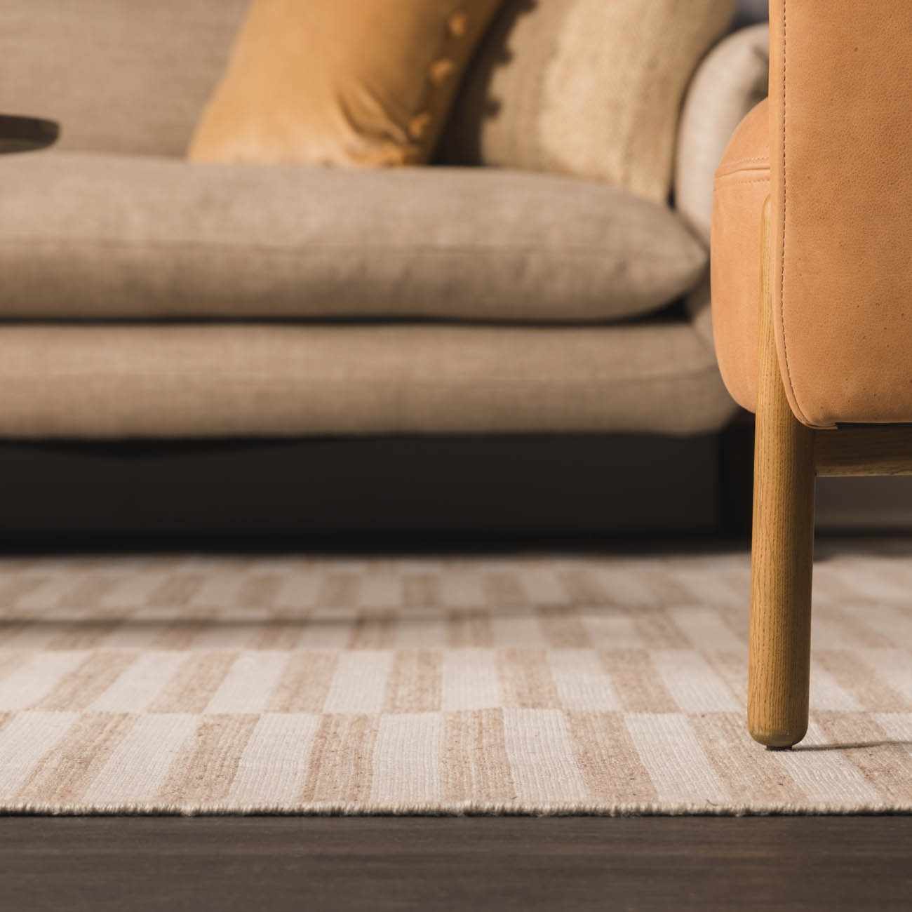 When selecting a living room rug, choose one that anchors your furniture by either placing all the legs on the rug or just the front legs, which helps define the seating area and enhances the room’s acoustics.