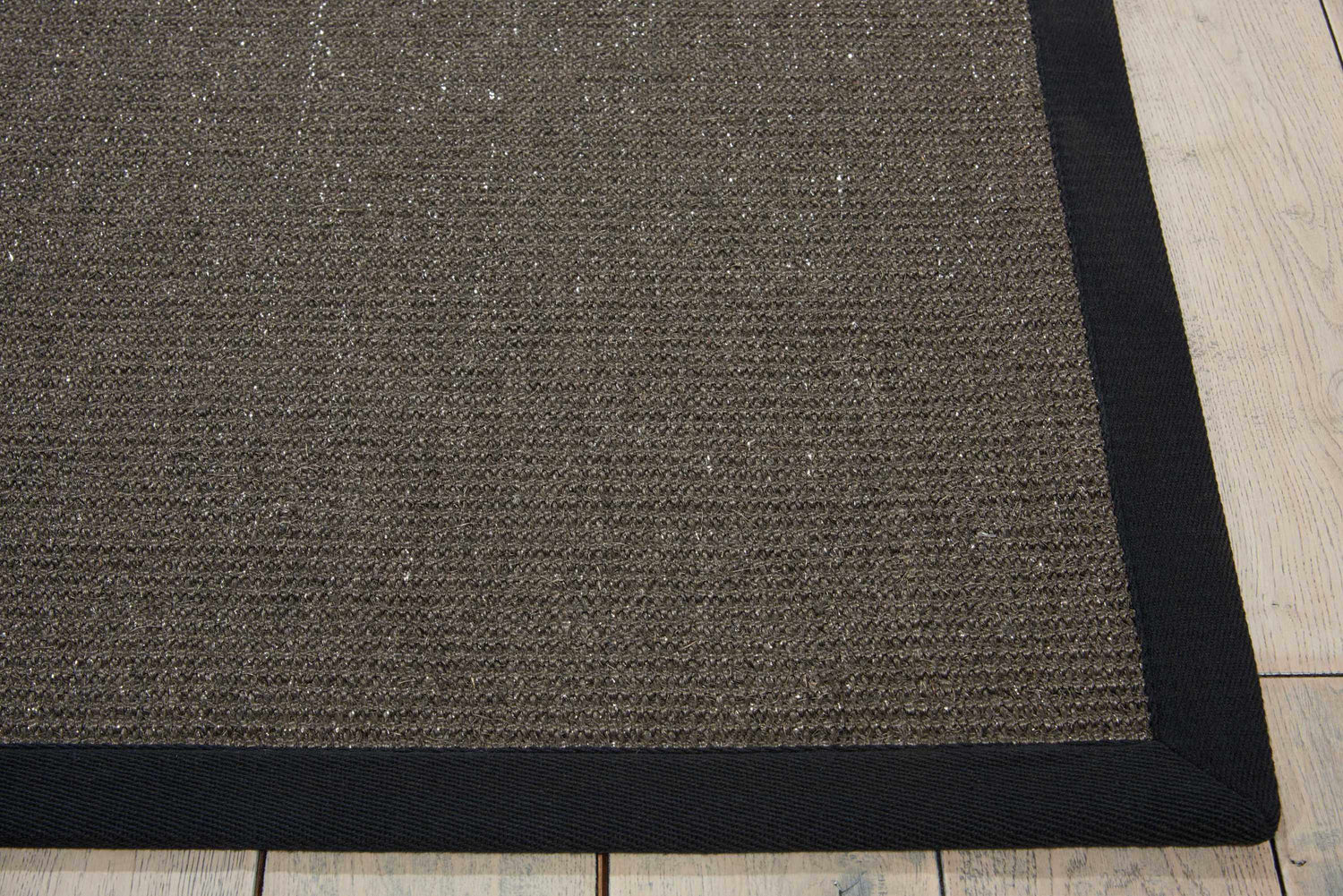 A rectangular area rug with a solid, uniformly woven charcoal gray field covering the majority of the surface. The texture is tight and low-pile, resembling a natural sisal or woven fiber weave with subtle surface variation visible up close. A wide, flat black border frames all four edges, creating a clean and sharp contrast against the charcoal interior. The edges are neatly bound with no fringe or tassels. The overall impression is minimal, tailored, and quietly sophisticated — a dark neutral with strong graphic structure from the border alone.