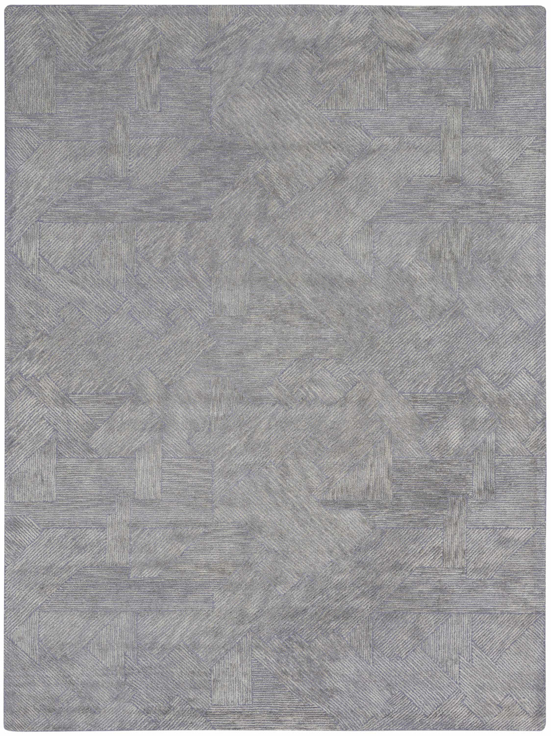 A rectangular runner-proportioned area rug rendered entirely in slate gray tones, featuring a tone-on-tone geometric pattern of interlocking angular lines, cross-like motifs, and rectilinear shapes that create a subtle grid-like composition across the surface. The pattern is achieved through variations in pile direction and texture rather than color contrast, giving the rug a dimensional, almost embossed appearance that shifts with light. The pile is medium height with a smooth, dense surface and a slight sheen in certain angles. Edges are cleanly bound with no fringe or tassels. The overall impression is of a refined, modern rug with quiet visual depth — understated but clearly well-crafted.