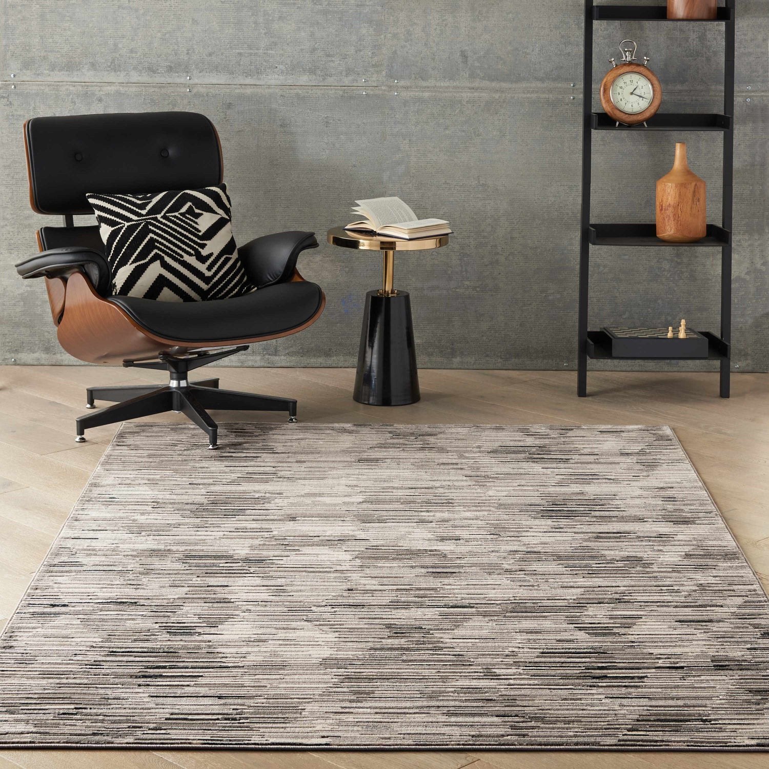 cool paletteA cool, layered palette of mid-gray and ivory dominates, with scattered accents of dark charcoal and warm taupe woven through the broken-stripe pattern — the overall effect is calm, sophisticated, and endlessly versatile.