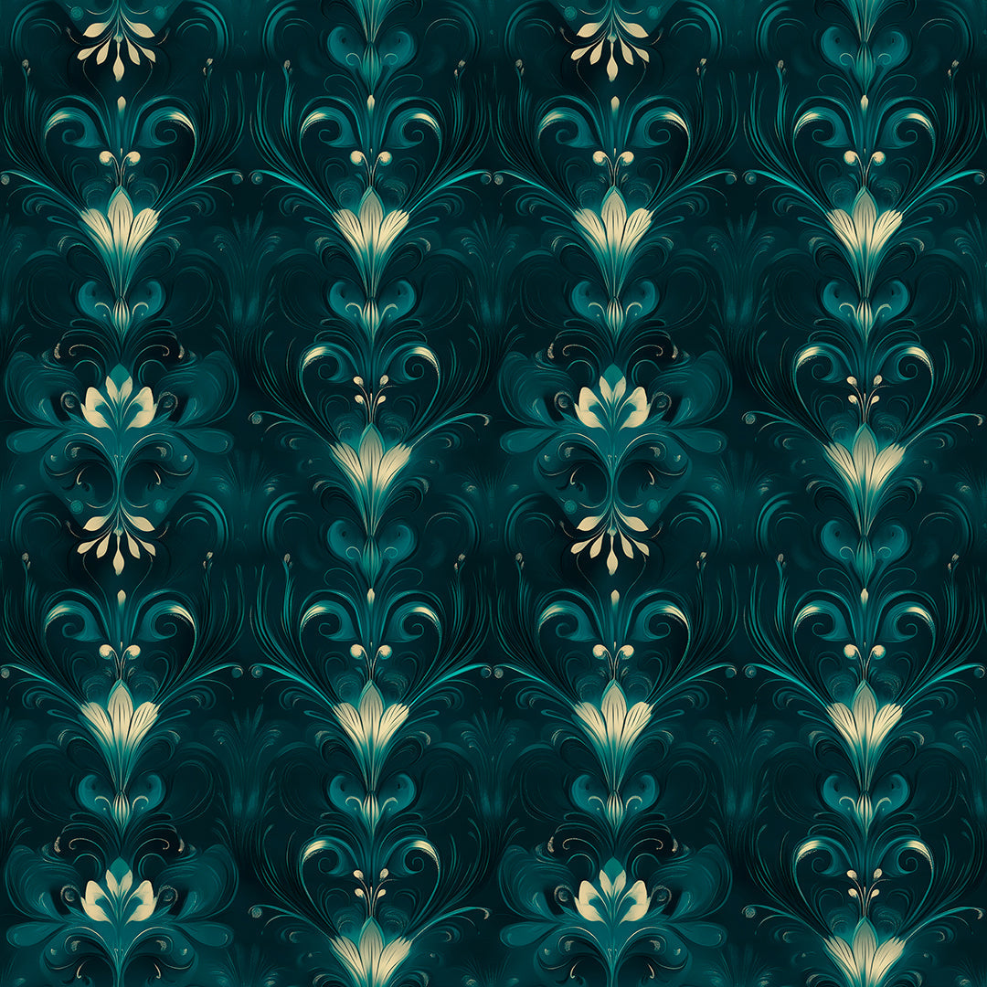 Embrace opulent elegance with this intricate damask design. Luminous cream-colored flourishes rise from a deep, moody teal background, creating a sense of dramatic sophistication. This wallpaper is an ideal choice for a luxurious accent wall in a bedroom, living room, or dining area.