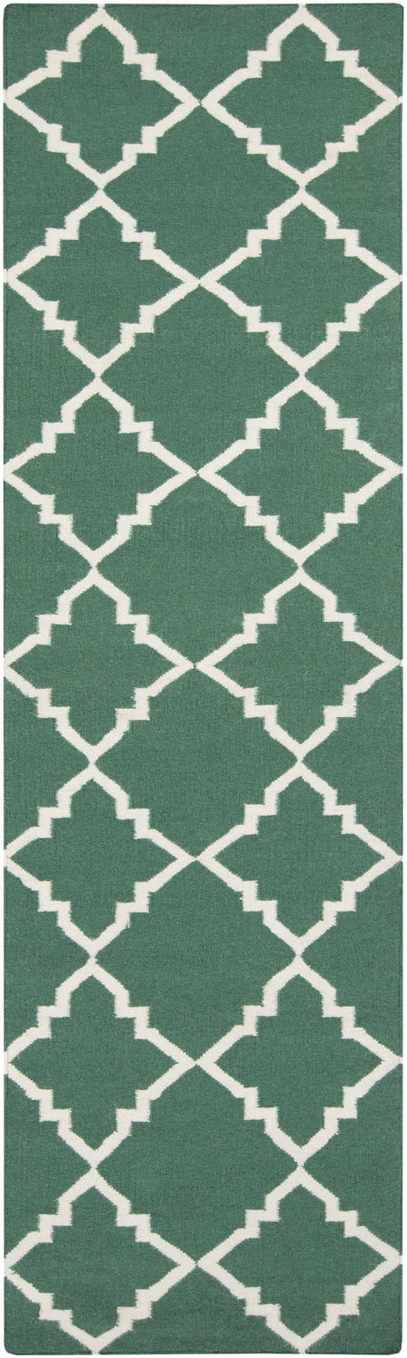 The Minehead Area Rug is a striking hand-woven wool flatweave that makes an immediate statement with its rich emerald green base and crisp white trellis pattern. The classic Moroccan-inspired quatrefoil lattice repeats across the entire surface in a clean, confident grid — bold enough to anchor a room, refined enough to let your furniture shine. Crafted from 100% wool in India, this rug is built to handle everyday life: the tight flatweave construction means virtually no shedding, easy spot cleaning, and a durability that holds up in high-traffic areas like living rooms, dining rooms, and hallways. At just 0.16 inches thick, it lays flat quickly and works beautifully as a layering piece over natural fiber rugs. The deep jewel-toned green brings warmth and personality without overwhelming a space, making it equally at home in a modern, contemporary, or transitional interior. If you've been searching for a wool rug that's as practical as it is eye-catching, the Minehead delivers on both counts.